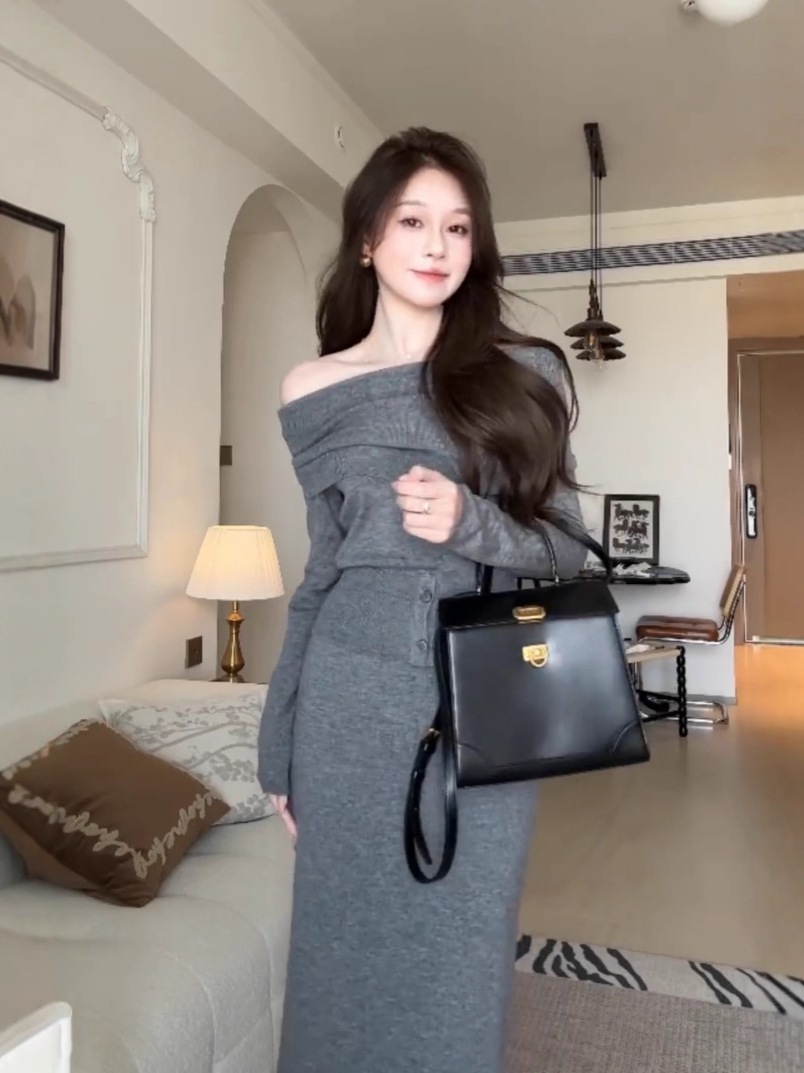 オフショルダーでリラックスしたスタイル柔らかく洗練された雰囲気の秋冬にぴったりなエレガントなニットトップスのツーピースセット高級なスカートのセットです