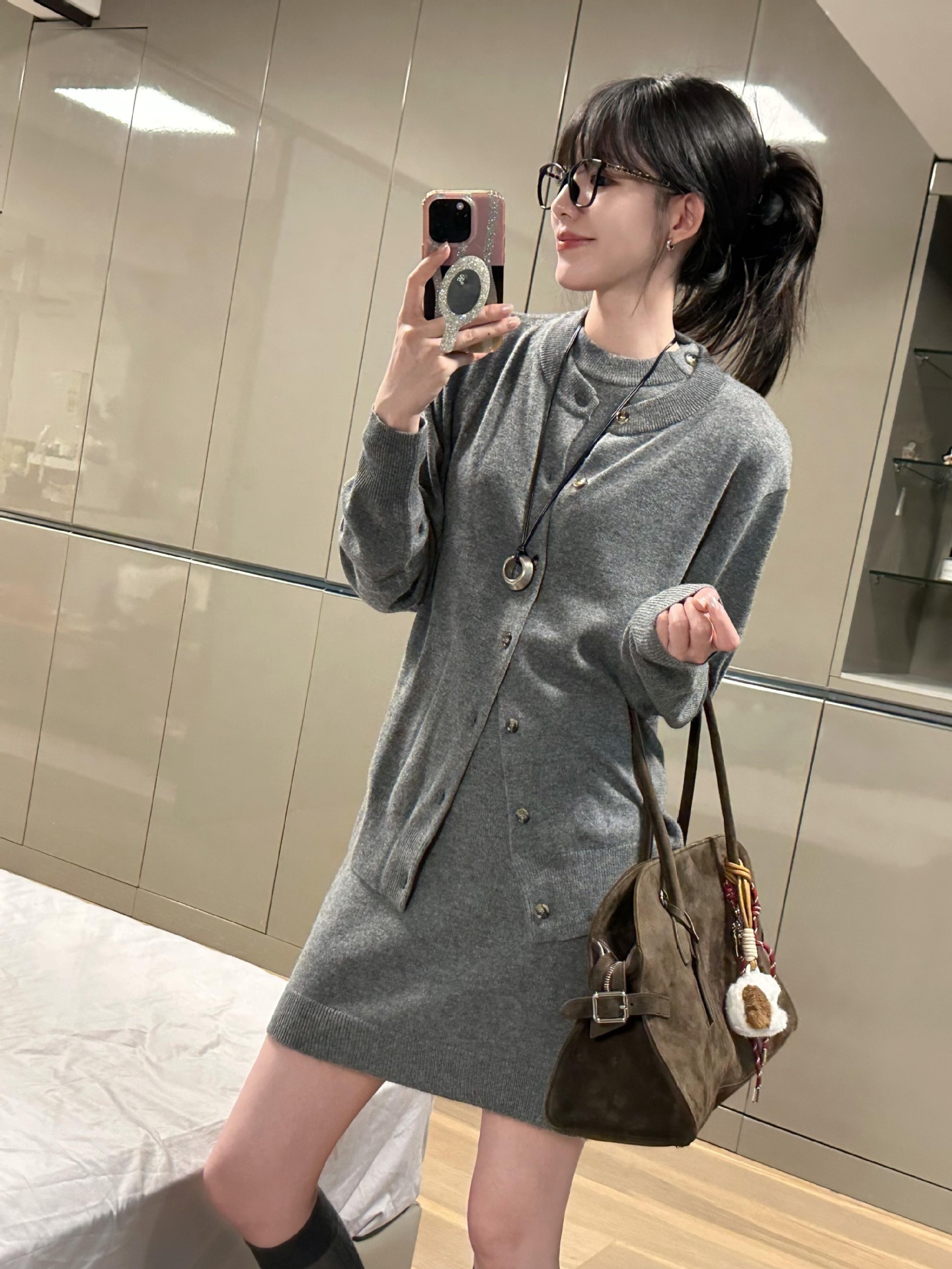知的なスタイルを醸し出すレディース向けニットカーディガンベストドレスのフルセット
