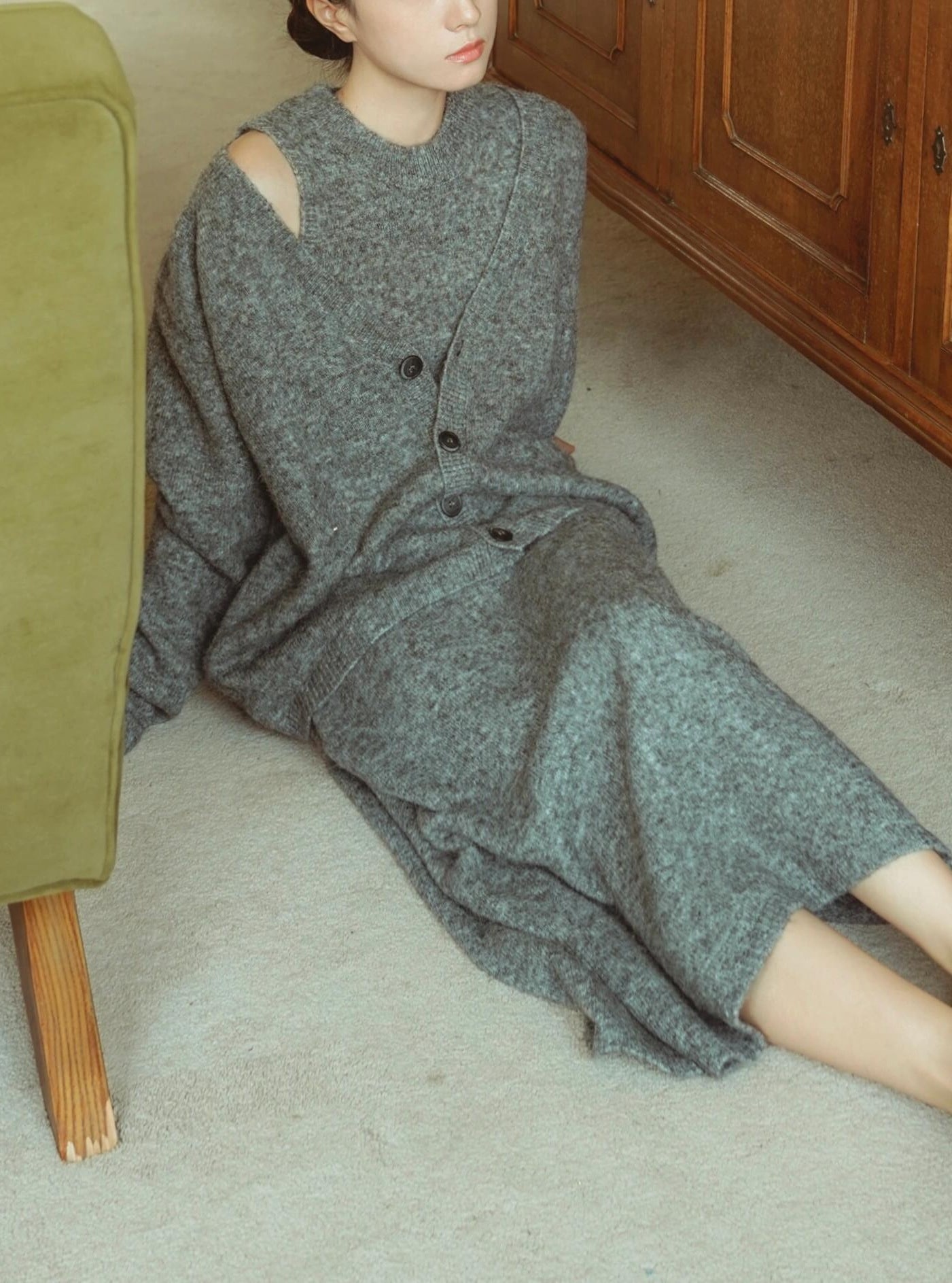 カジュアルでリラックスしたスタイル秋冬用のグレーのニットセーターベストワンピースのゆったりとしたツーピースセット