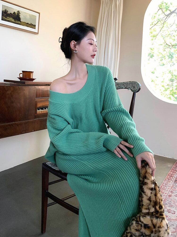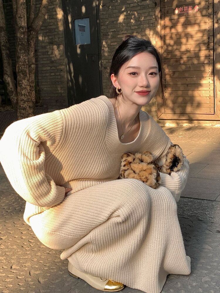 初秋のお茶をイメージしたコーディネートアプリコット色のニットトップスとスカートのツーピースセットでリラックスしたスタイルを演出したレディース