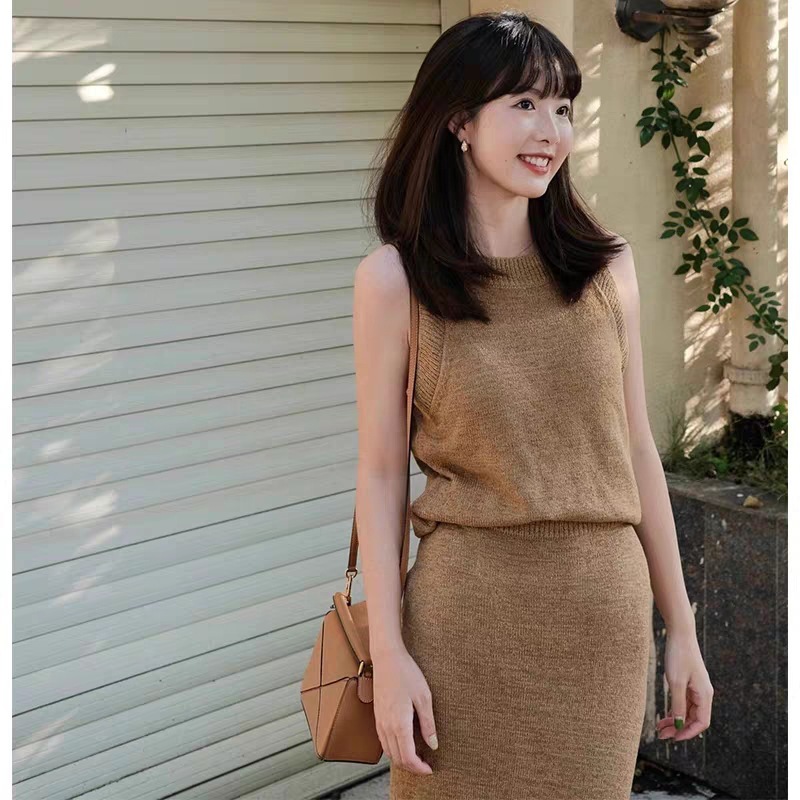 レディース用エレガントキャメルニットベストセット - 高級感のあるセクシーでリラックス感のあるボディコンスカート(ツーピースセット)