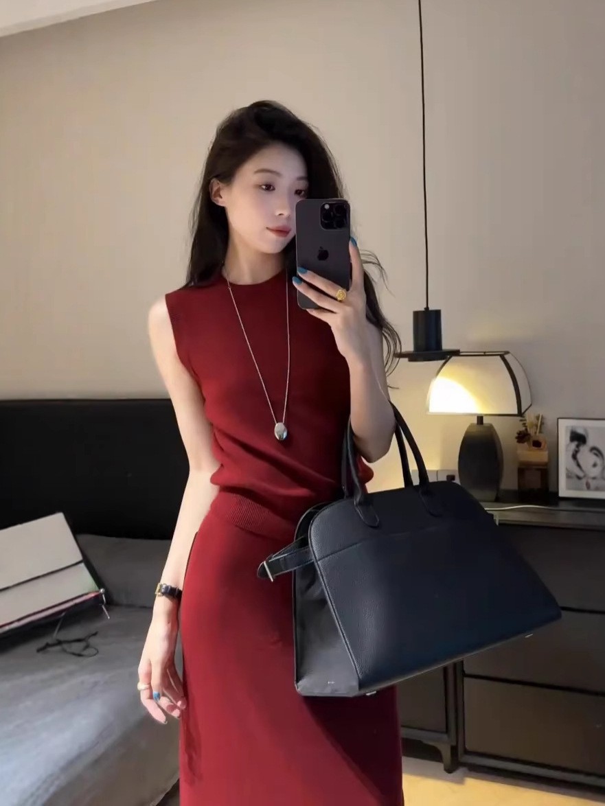 今年トレンドのツーピースセットは赤いノースリーブトップスとスリムスカートが特徴で洗練されたエレガントな雰囲気を醸し出します
