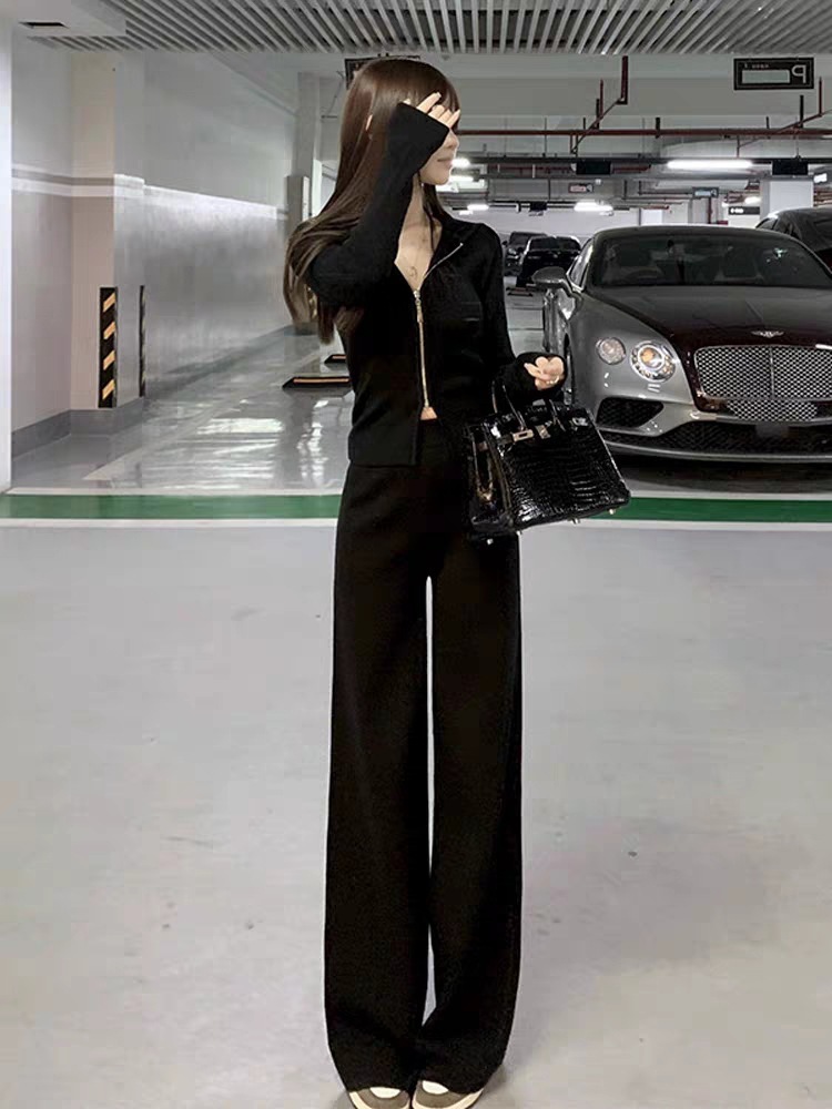 秋冬用のレディースワイドレッグパンツとスウェットシャツトラックスーツをエレガントなツーピースドレスと組み合わせたセットです
