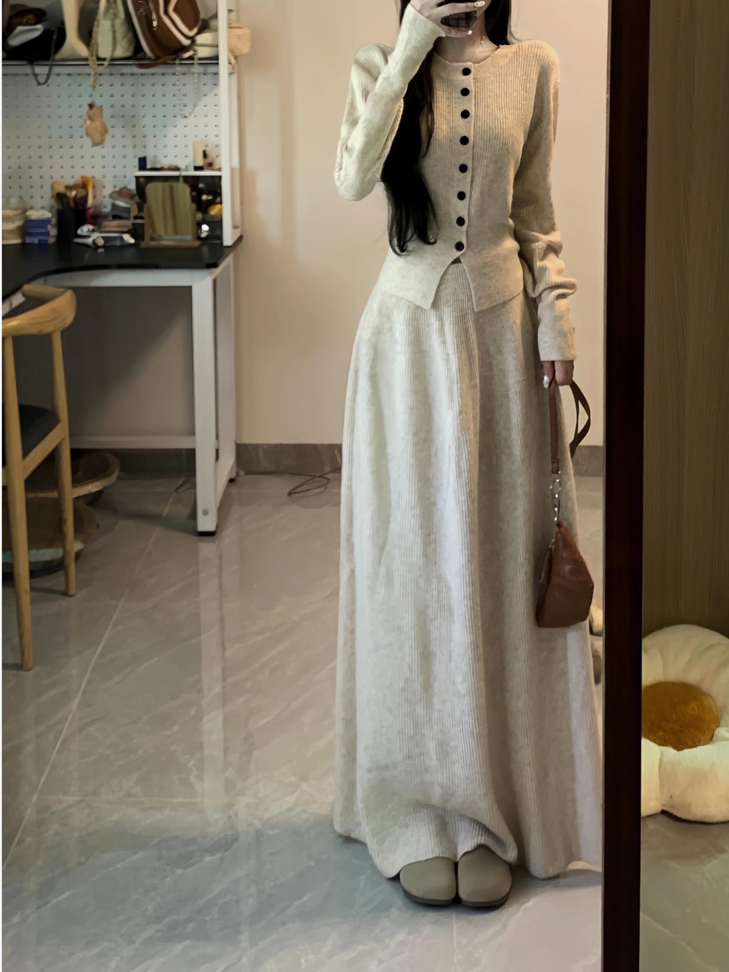 エレガントで洗練された初秋の装いニットカーディガンセーターロングスカートのツーピースセットはスタイリッシュで若々しい印象です