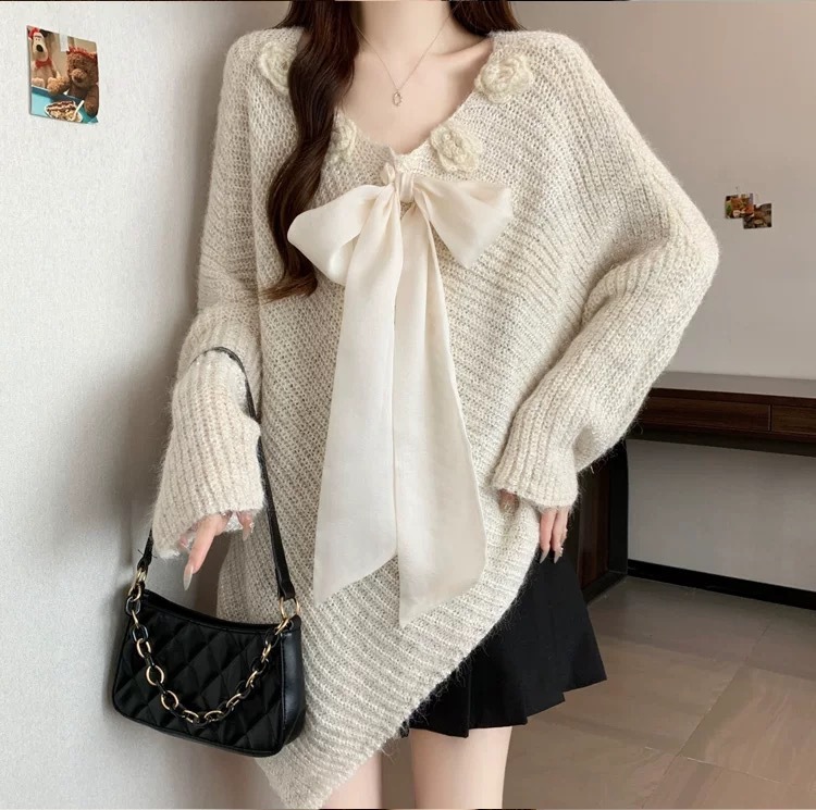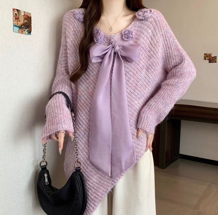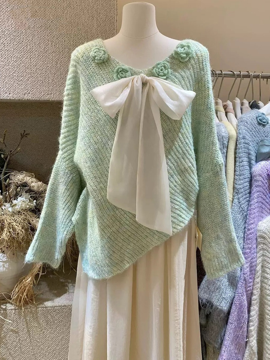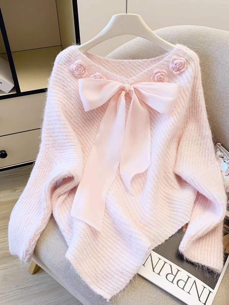10個セット 立体フラワーリボンニットトップス女2025秋冬不規則感セーター