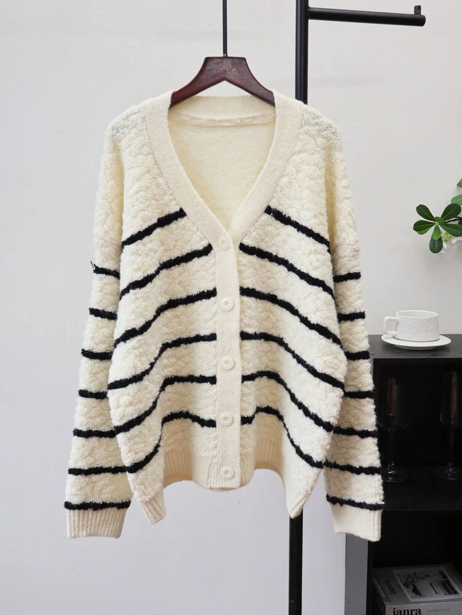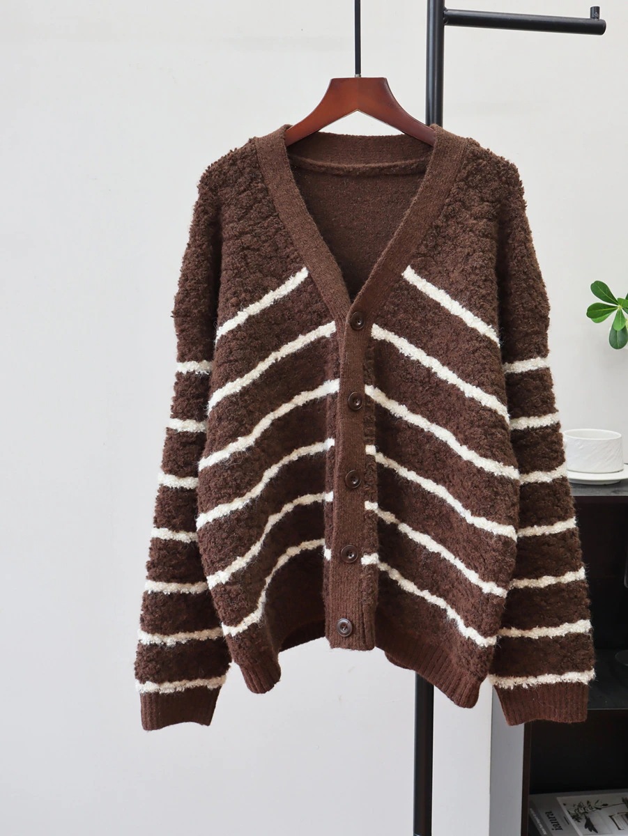 10個セット 2025秋冬衝突色ストライプ丸編みニットカーディガン韓国版ゆったりモチモチカジュアルセーターコート女