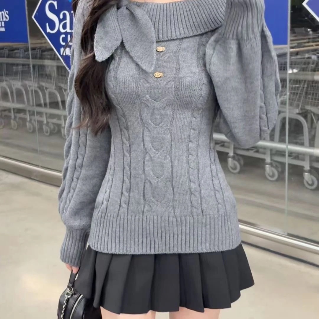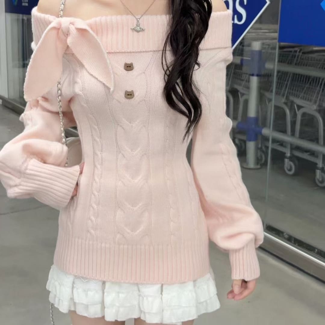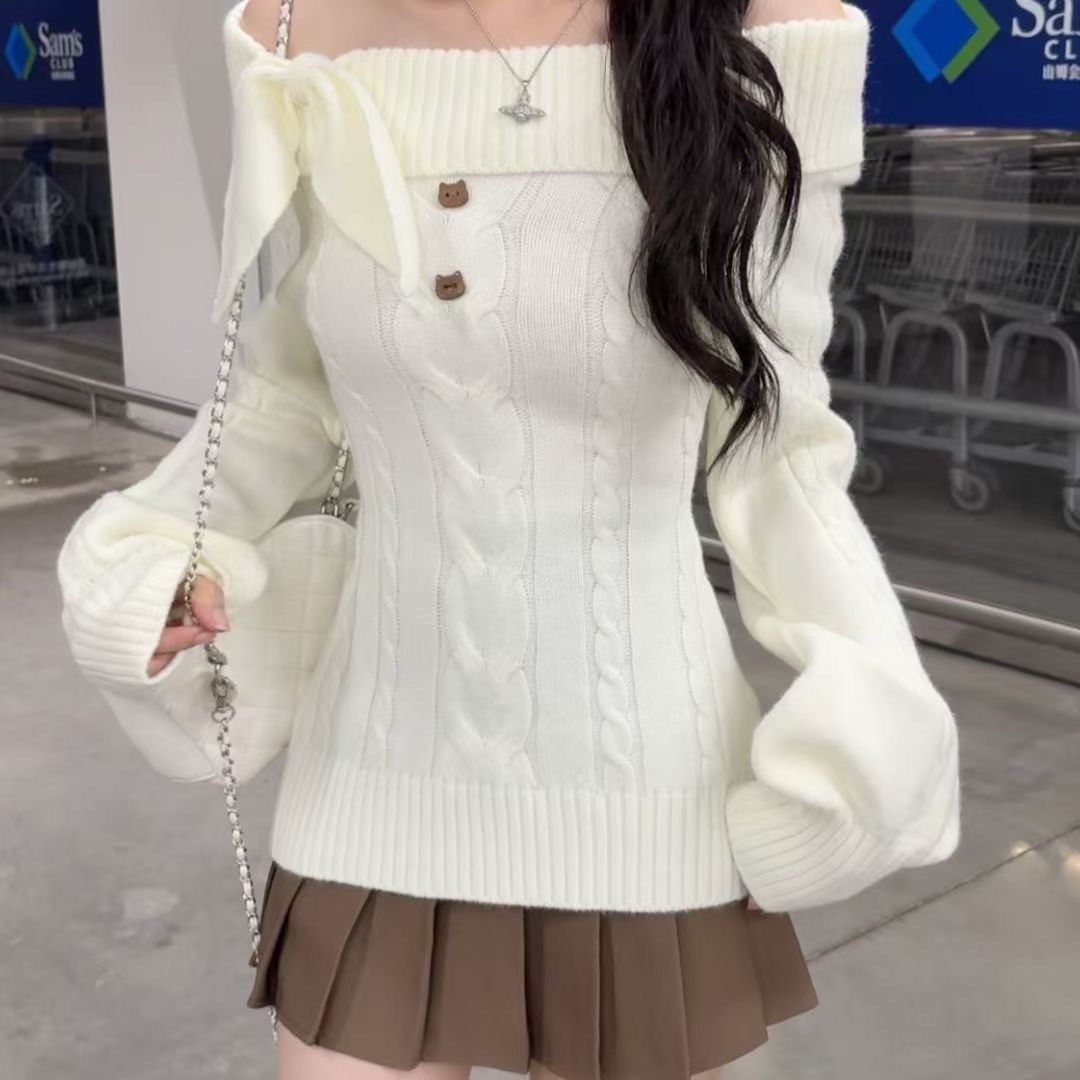 10個セット 風一文字肩長袖ニット女2025秋冬スレンダー着やせモチモチプルオーバーセーター