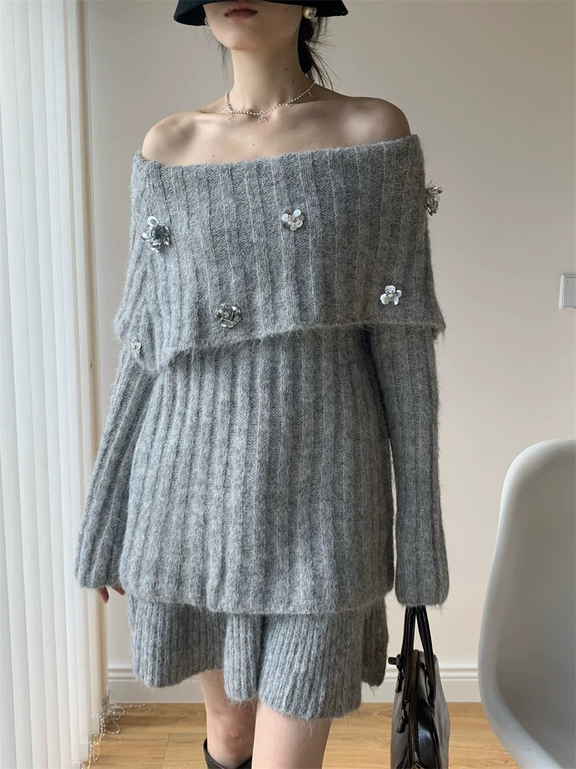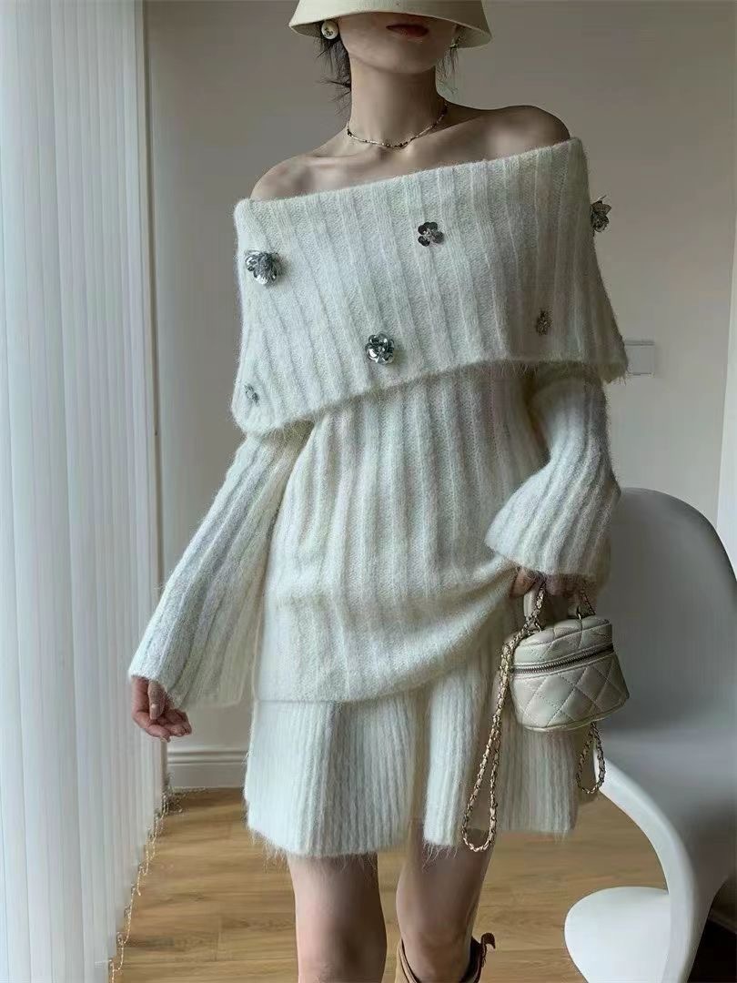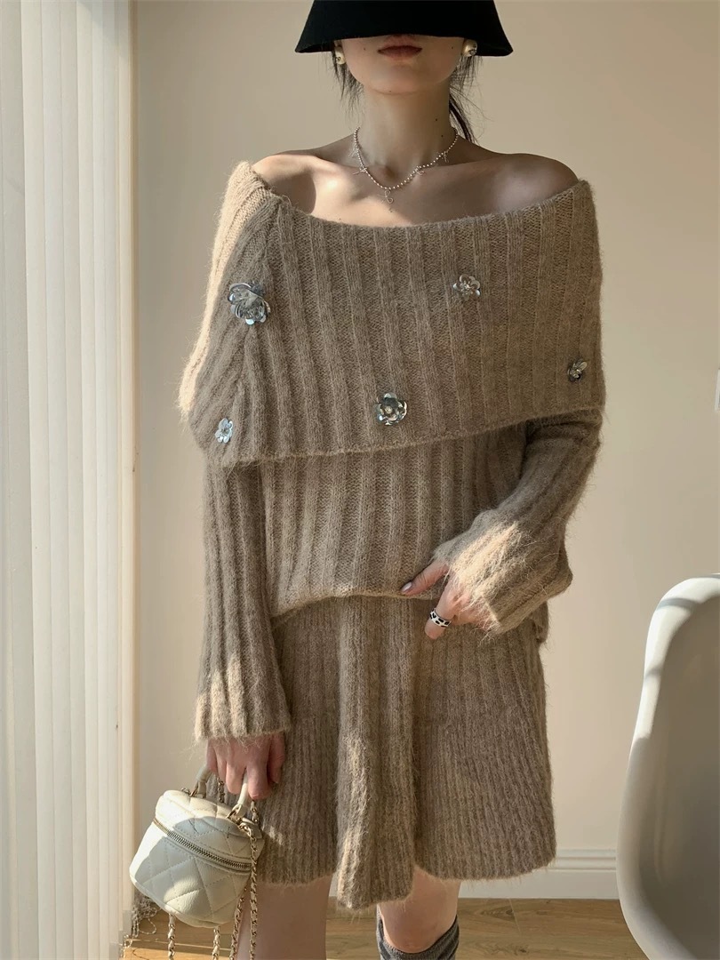 10個セット 2025秋冬韓系セットアップ女感ワンワードショルダーセーター+ニット半身スカートの2点セット