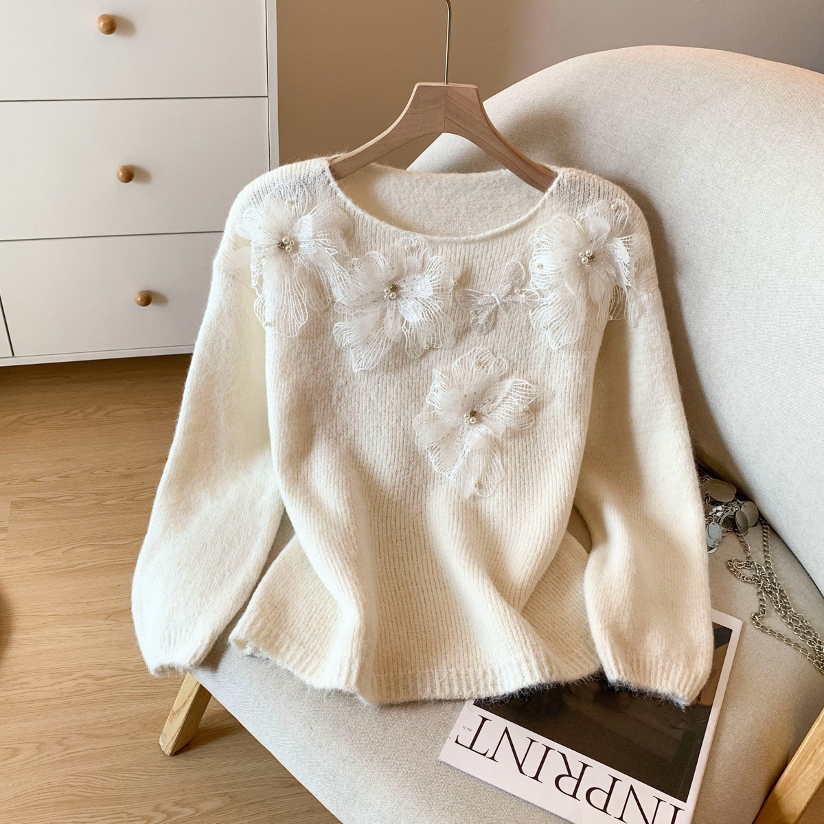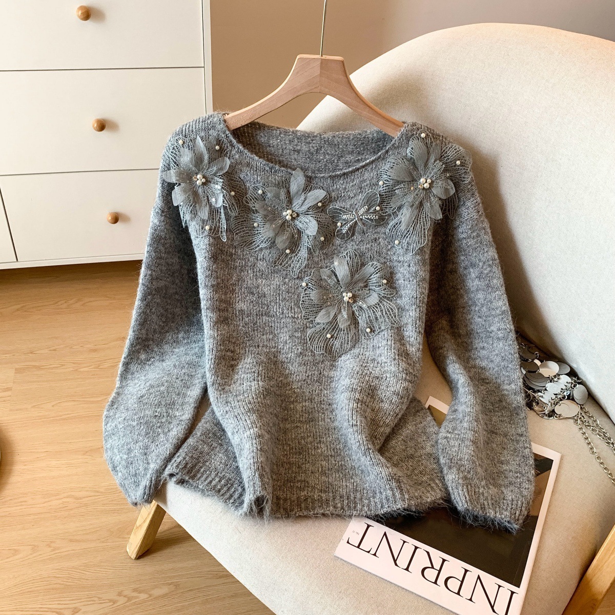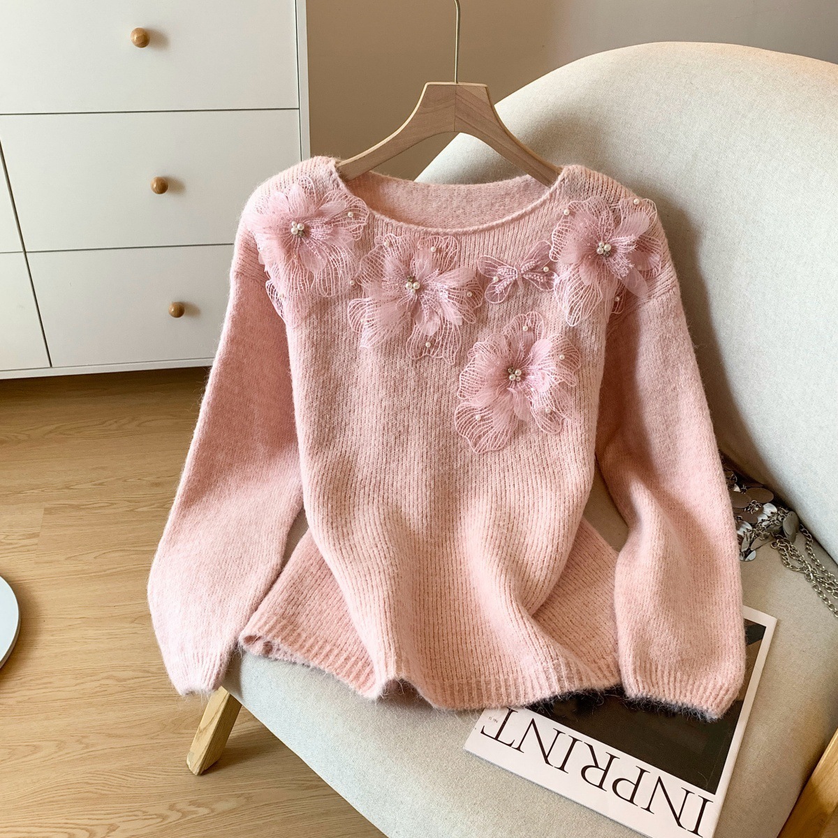 10個セット レースの花ニットセーター女秋冬のけだるい風ゆったり減齢トップス