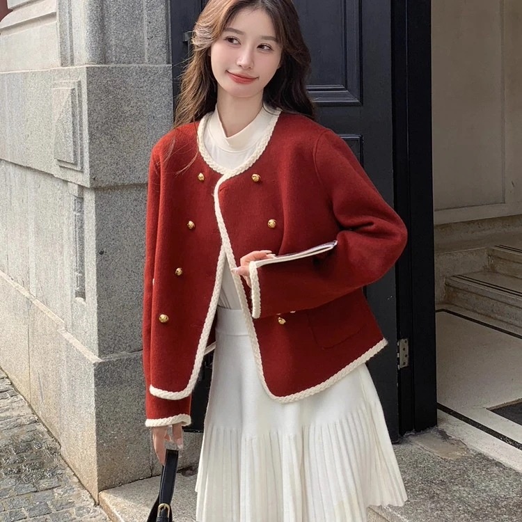 10個セット 高級感のある2列のボタンダウンコート女性の秋冬韓国版丸首のゆったりとした上着は年齢を減らす
