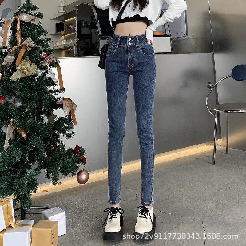 ブルーグレーデニムパンツ 女性用 ハイウエスト 細身効果 2025年秋冬 裏起毛 新作 ストレッチ タイトフィット スキニーペンシルパンツ