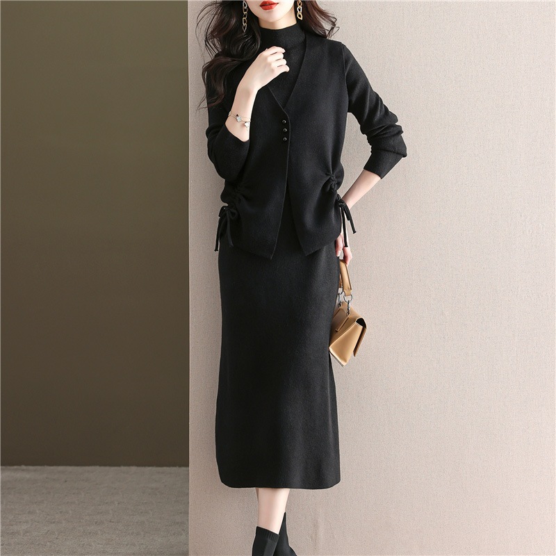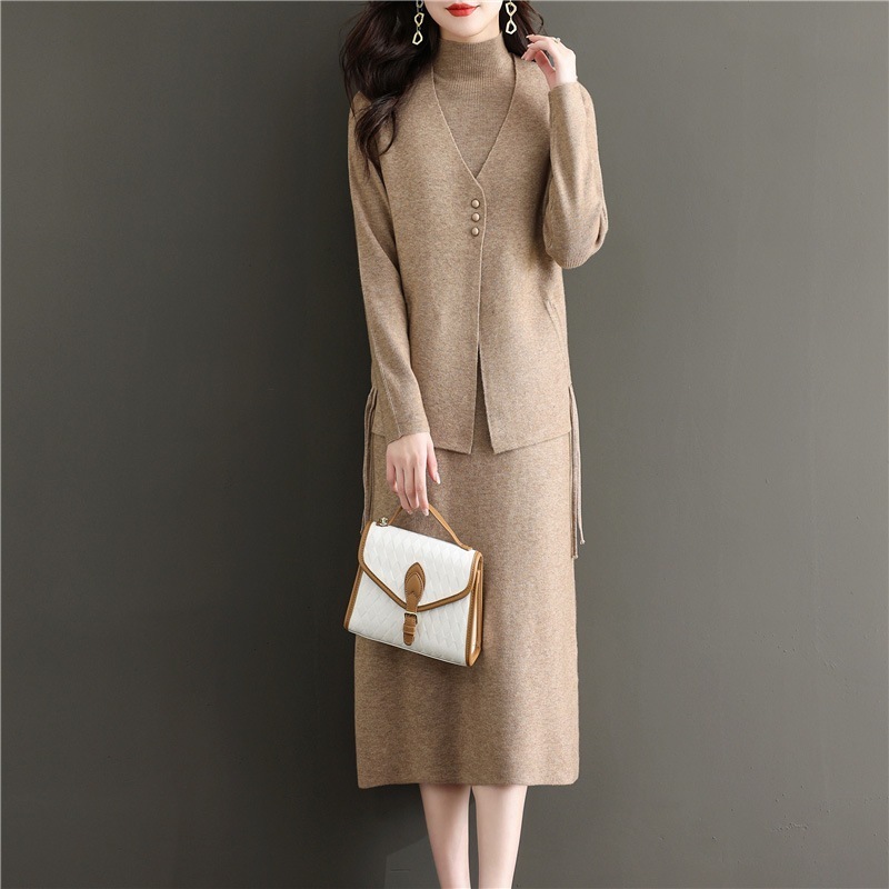 スタイリッシュでカジュアルなハイネックのレディーススーツ2025年秋ニットベストとワンピースのツーピースセット