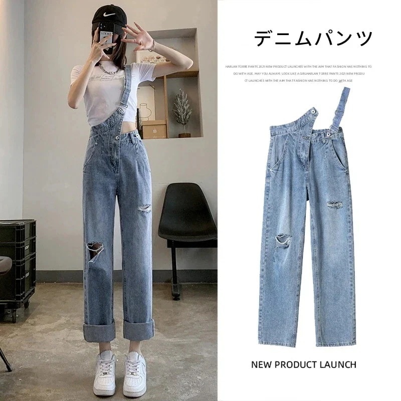 サロペット ワイ ダメージジーンズ 新商品 ライトブルー ジーンズ ハイウェスト 春 ドパンツ 着痩せ 脚長効果!スキニーパンツ ストレートパンツ