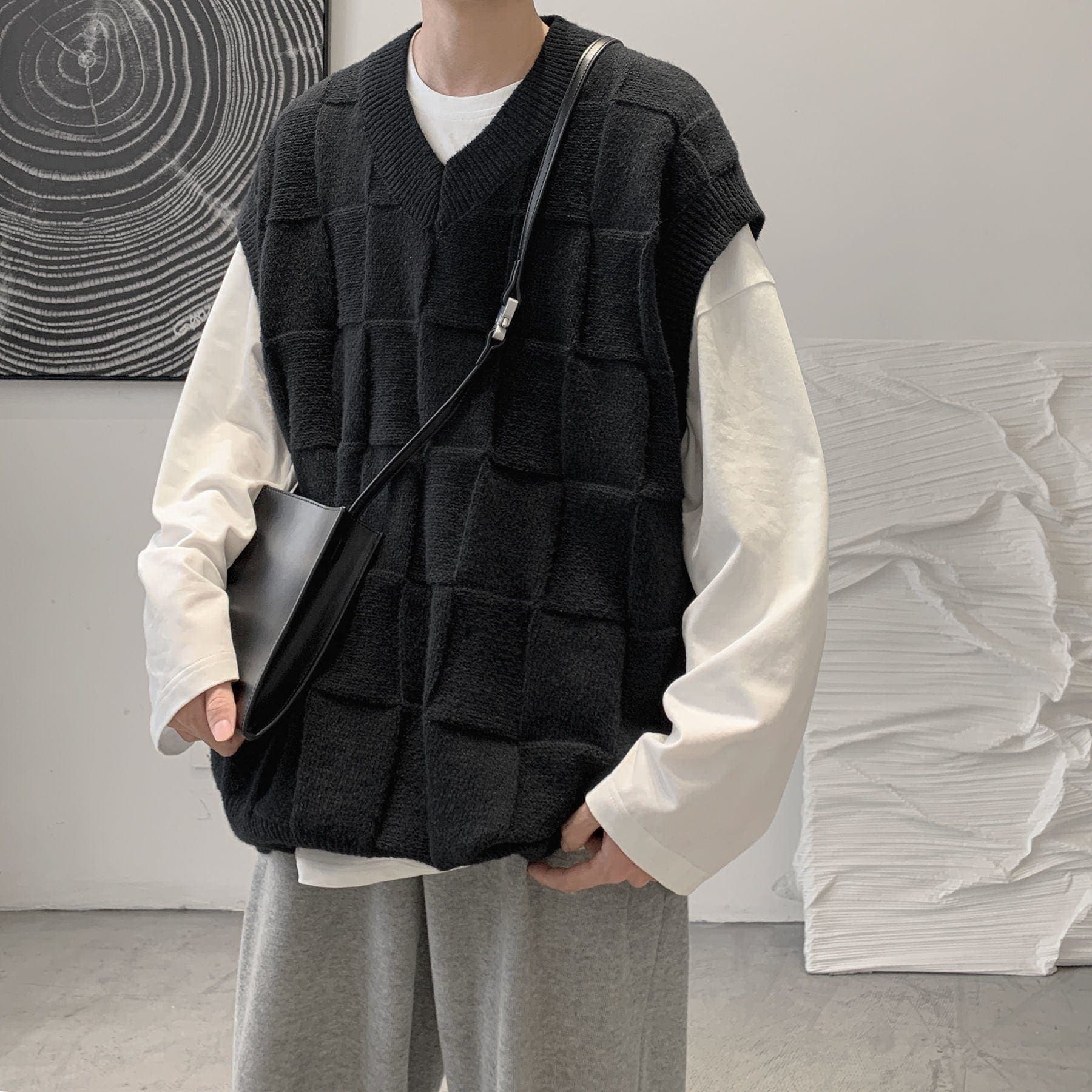 【人気商品】ニットベスト 韓国版新作純色チェックセーターベスト男女春秋新シンプルニットベストinsトレンドカップル