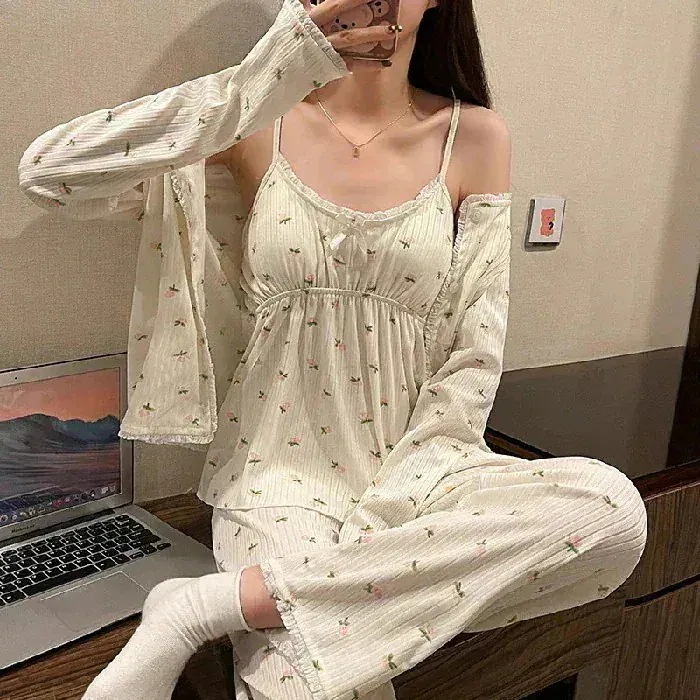 パジャマ ルームウェア 韓国ルームウェア 長袖カーディガン 3点セット 秋冬キュート花柄パジャマ 部屋着レディース