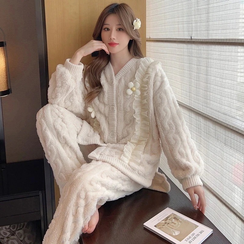 ひんやりボトムス 寝間着 もこもこ 裏起毛 パジャマ ルームウェア 花飾り セットアップ 柔らかい肌触り 上下セット 毛布 ふわふわ フランネル ロングパジャマ