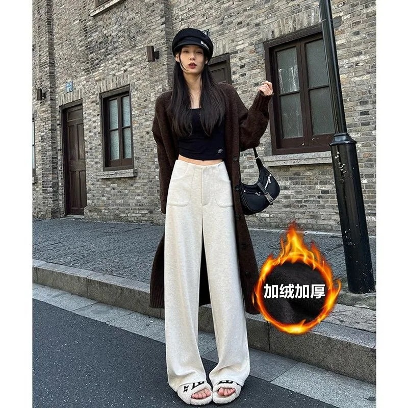 ホワイト ハイウエスト ワイドパンツ 裏起毛ラシャスーツパンツ 秋冬 カジュアルストレートパンツ ワイドパンツ レディース 防寒 OL 通勤