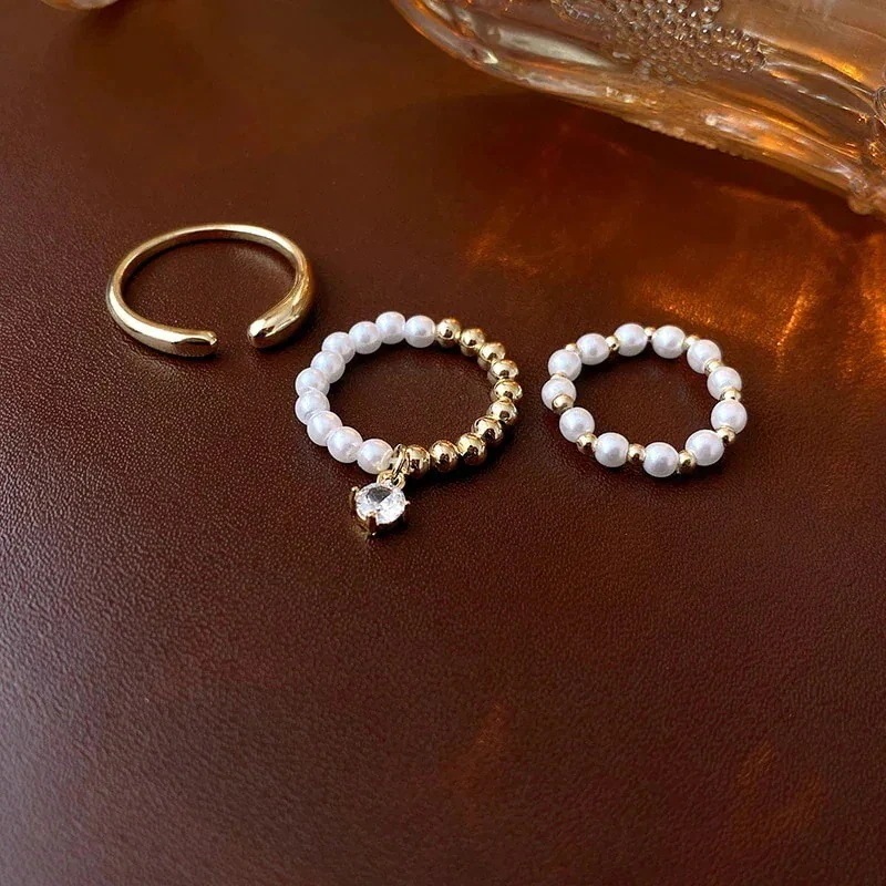 【人気商品】パールラウンドビーズストレッチリング3本セット ファッションシンプルで汎用性の高い人差し指リングライト豪華な気質ハンドジュエリー