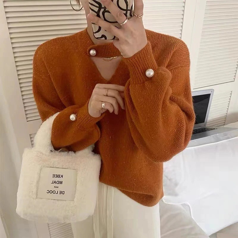 秋冬新作優しい雰囲気通勤パールボタンVネックキラキラセーター百掛けニットトップス カシミヤタッチ
