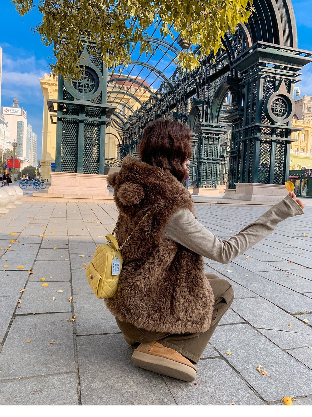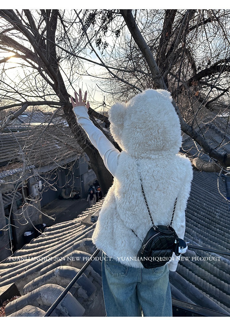 クマの耳とラムウールを使用した環境に優しいショート丈のフェイクベストレディースのフード付きファーコート小柄なスタイル