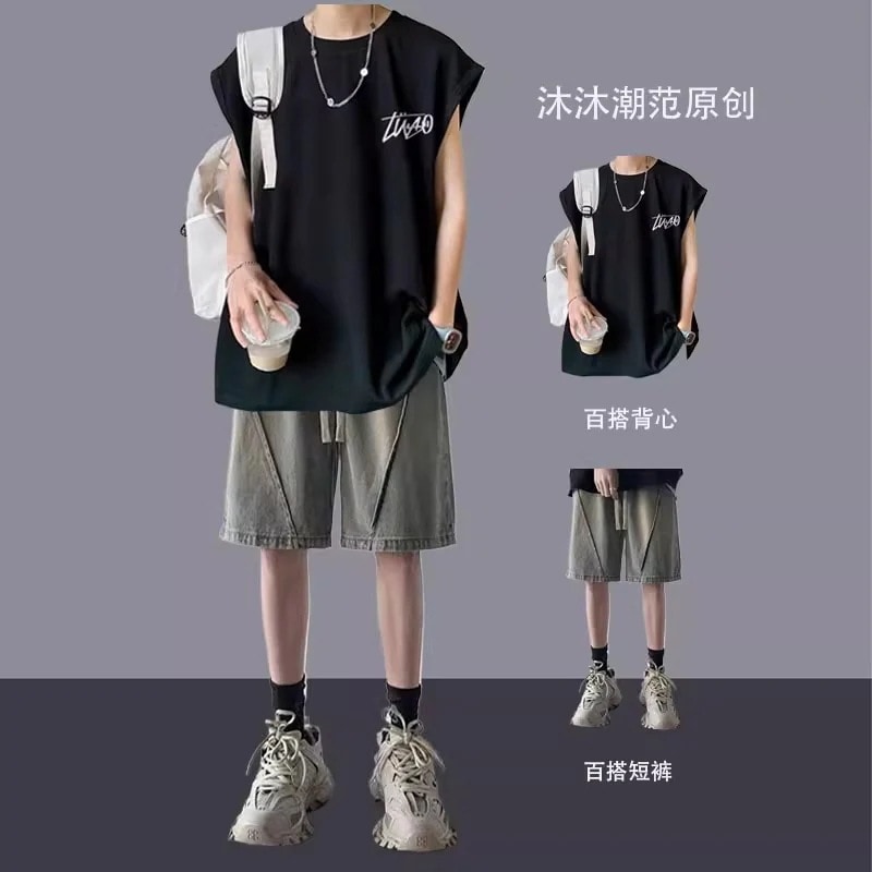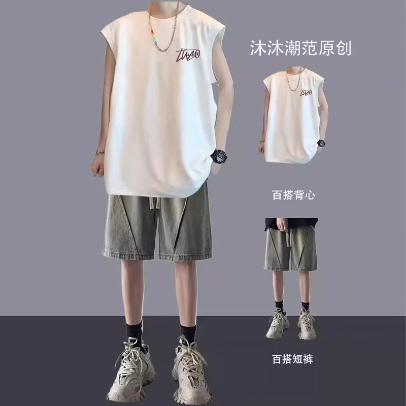メンズ セットアップ 純綿 タンクトップ セット メンズ 夏 キャミソール トレンド ノースリーブTシャツ メンズウェア 1セット コーディネート デニム ショートパンツ 2点セット