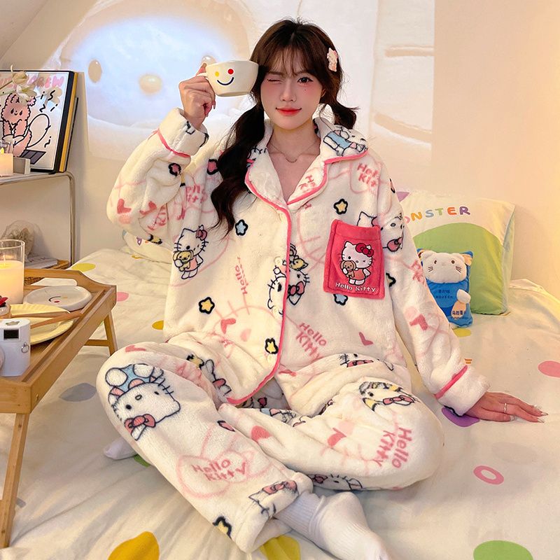 2025パジャマ もこもこ ルームウェア 人気 保温 冬ルームウェア キティちゃん 上下セット レディース もこもこ 厚手 パジャマ 部屋着 寝間着 トップス パンツ 暖かい 秋冬