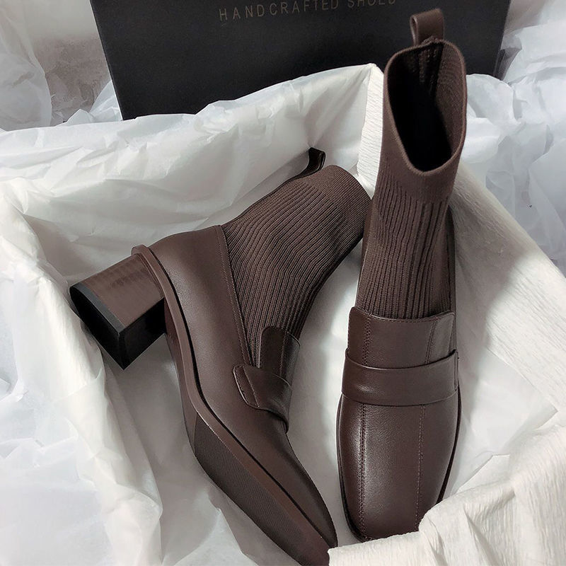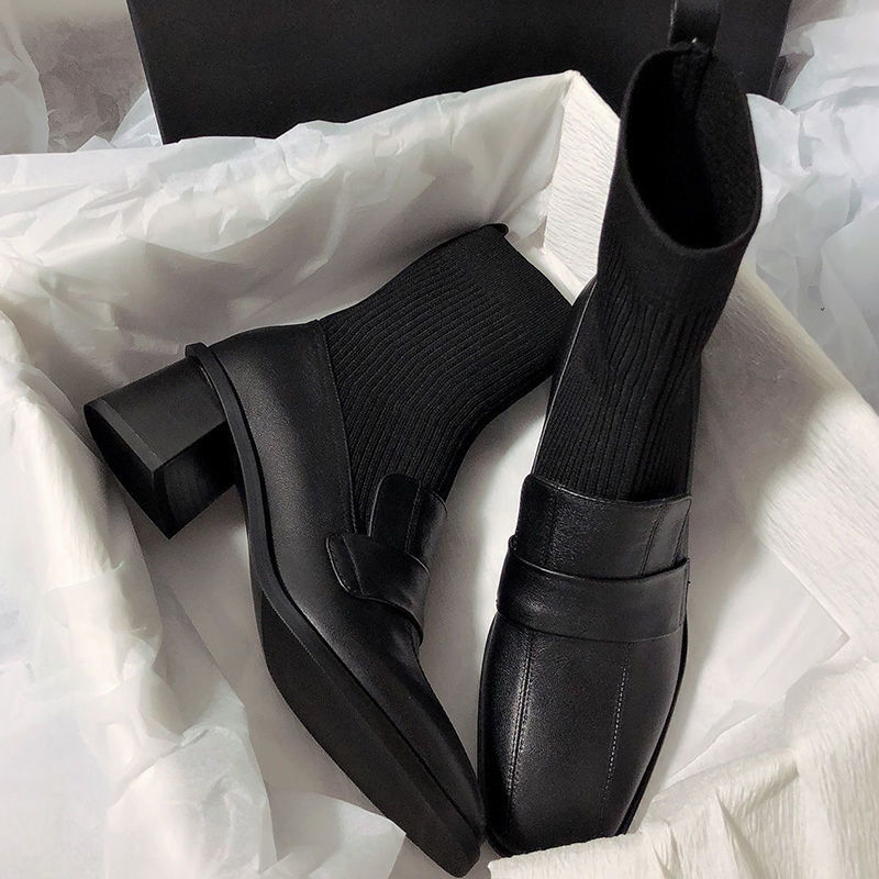 靴 レディース ショットブーツ ポインテッドトゥ 太ヒール ハイヒールパンプス スクエア靴 ミドルヒール 韓国ファッション