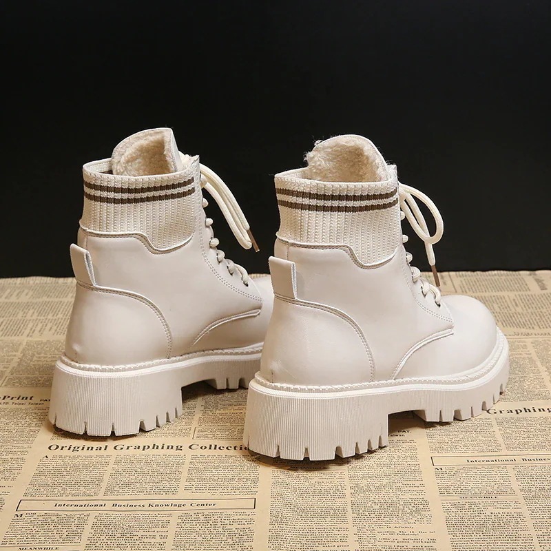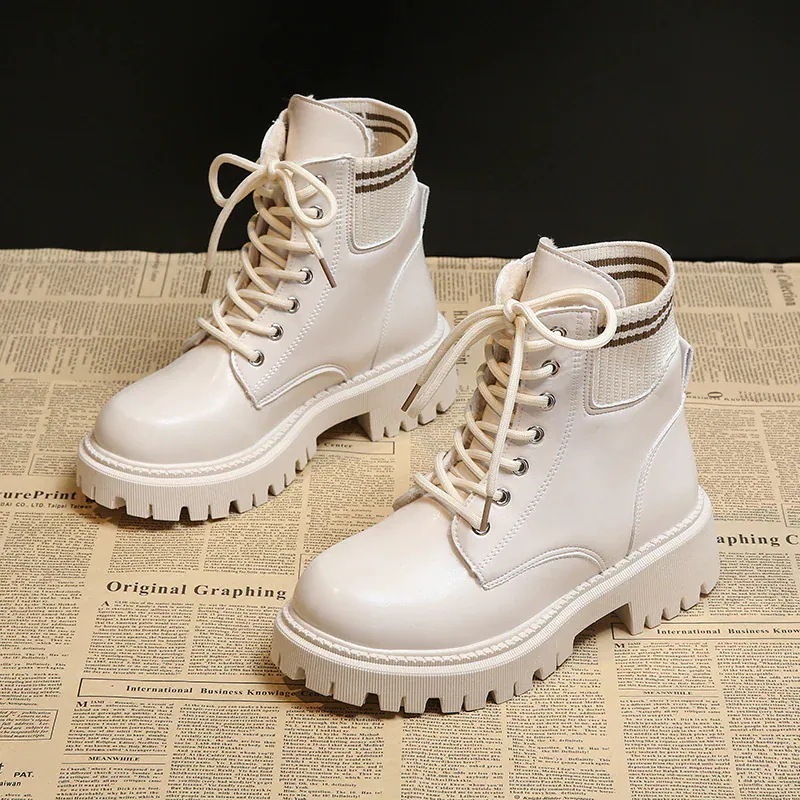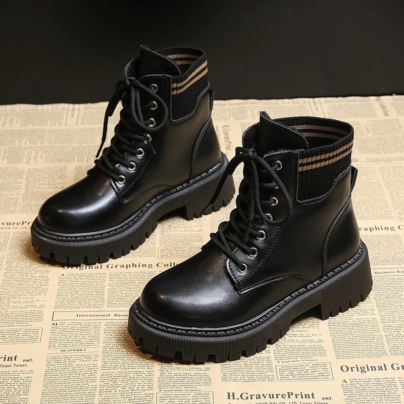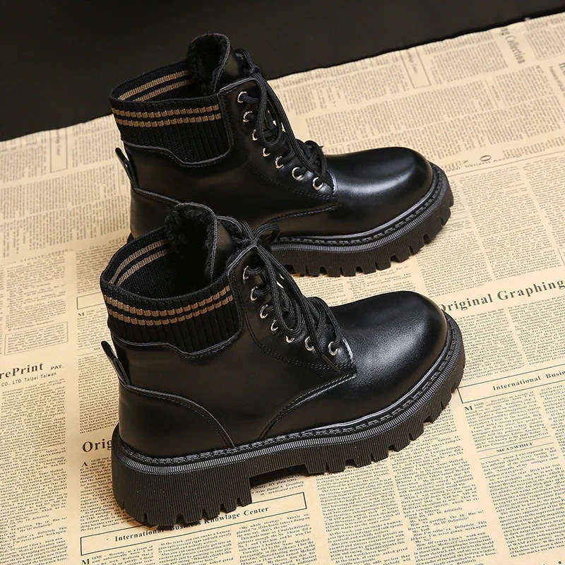 マーディンブーツ 秋冬 裏起毛 革靴 ドローストリング 美脚 質感 エレガント 気質 ショットブーツ 厚底靴松糕靴