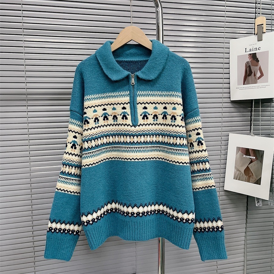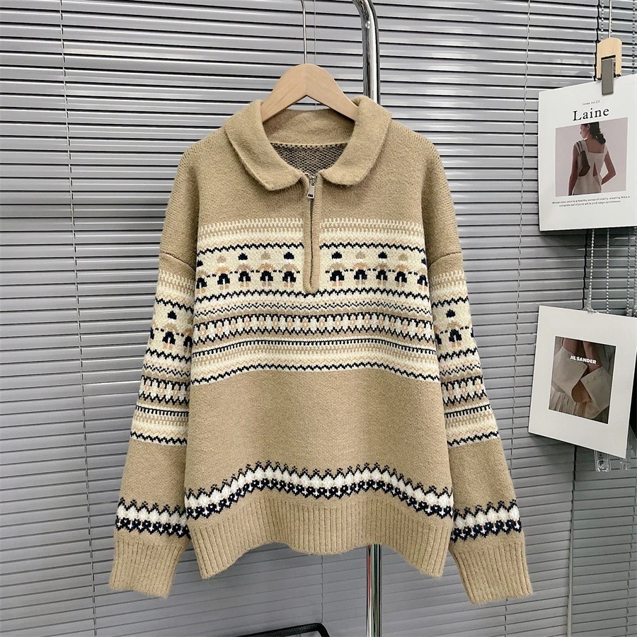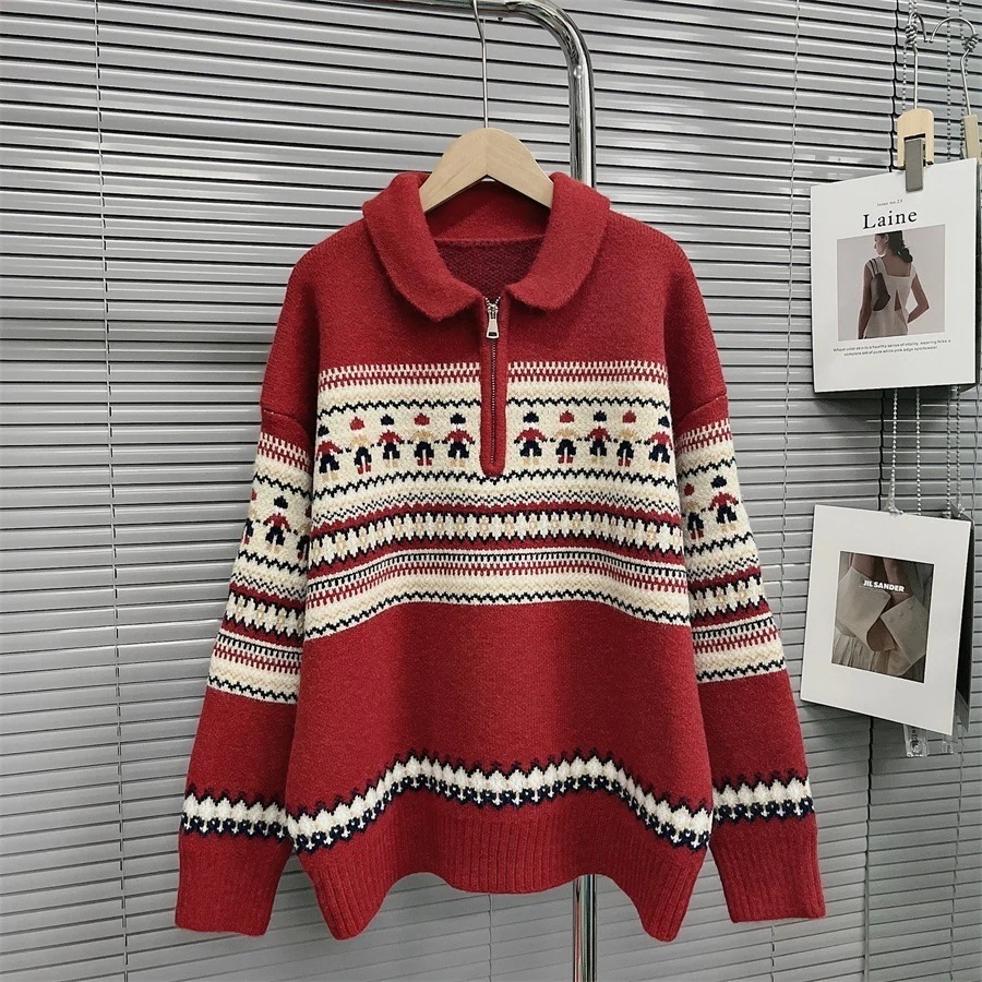 人気なリブニット クリスマスジャンパー女性秋と冬の新しい長袖ハーフジップポロ襟赤レトロ緩いプルオーバーニットセータートップス