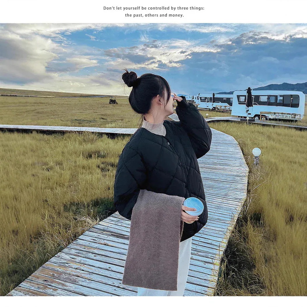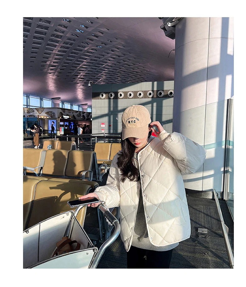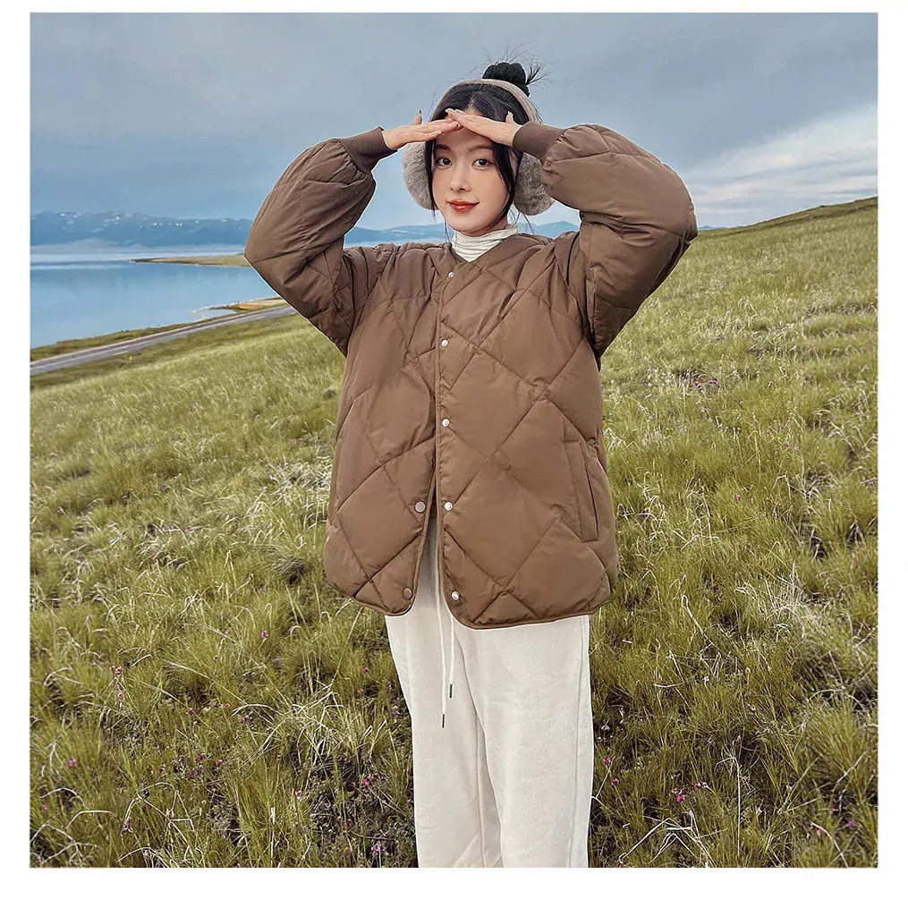 ダウンコート女性ショート丈薄手ノーカラーチェックダウンコートカジュアルジャケット