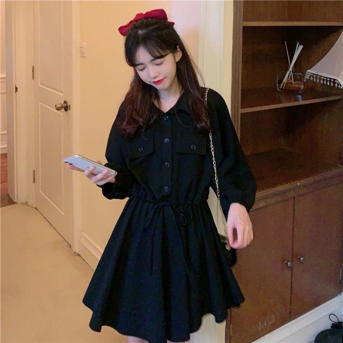 春物ポロネック長袖ワンピース女性用秋物韓国風ドローストリングウエストシェイプ小柄な方におすすめAラインスカート