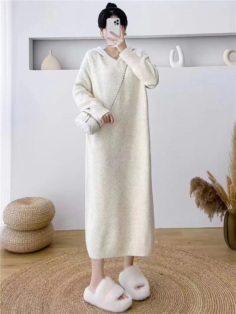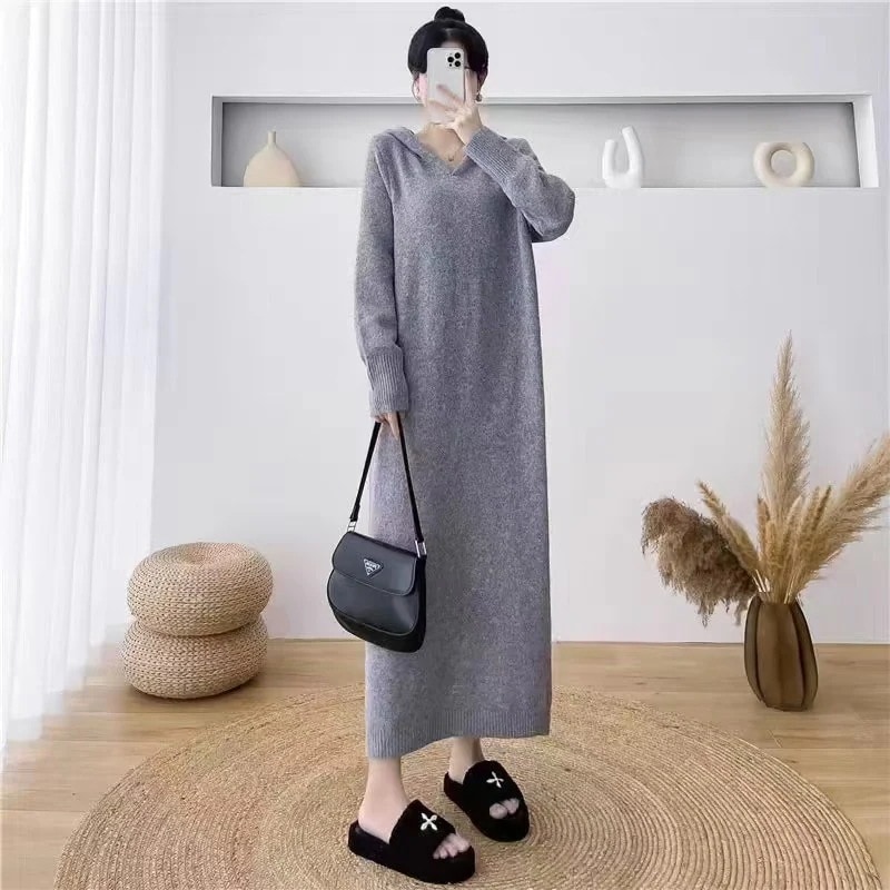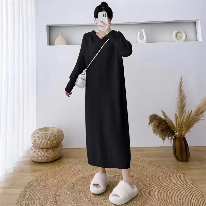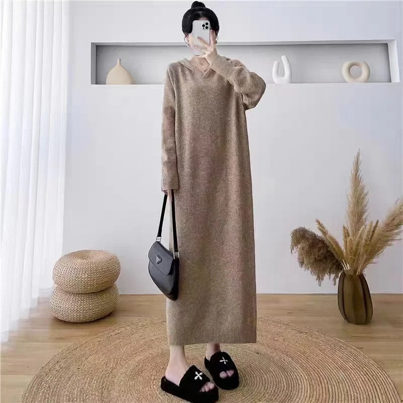 ゆったりフーディニットワンピース レディース秋冬新作 ゆったりシルエットで細身効果 オーバーサイズミドル丈セーター 女性のジャケット