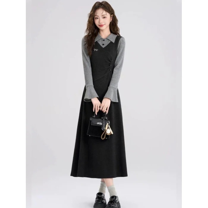 フレンチレトロ風ニットワンピース風 秋冬新作 大きめサイズ ぽっちゃり体形向け 偽ツーピース ブラックロングドレス レディースウェア