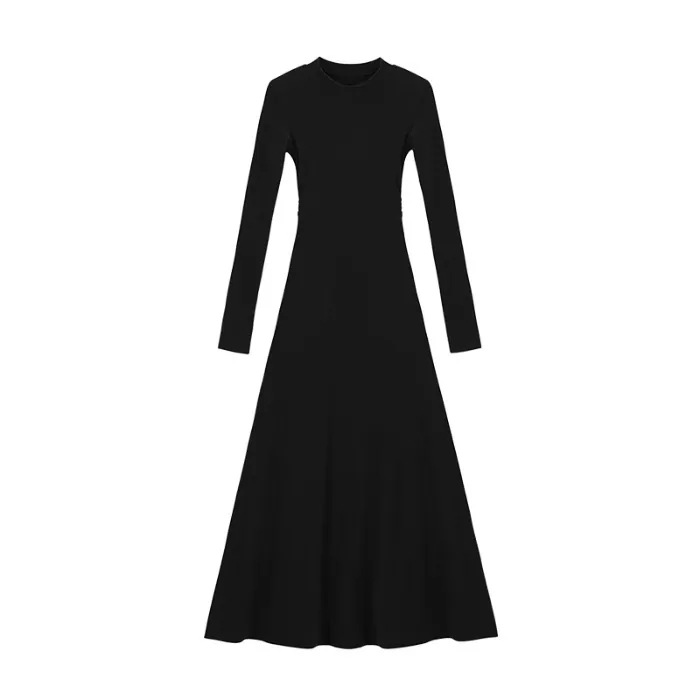 ブラック丸首パッド付きロングスリーブワンピース女性用秋冬用エレガントなウエストシェイプスリムフィットインナーロングドレス