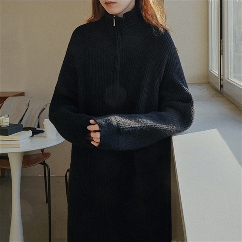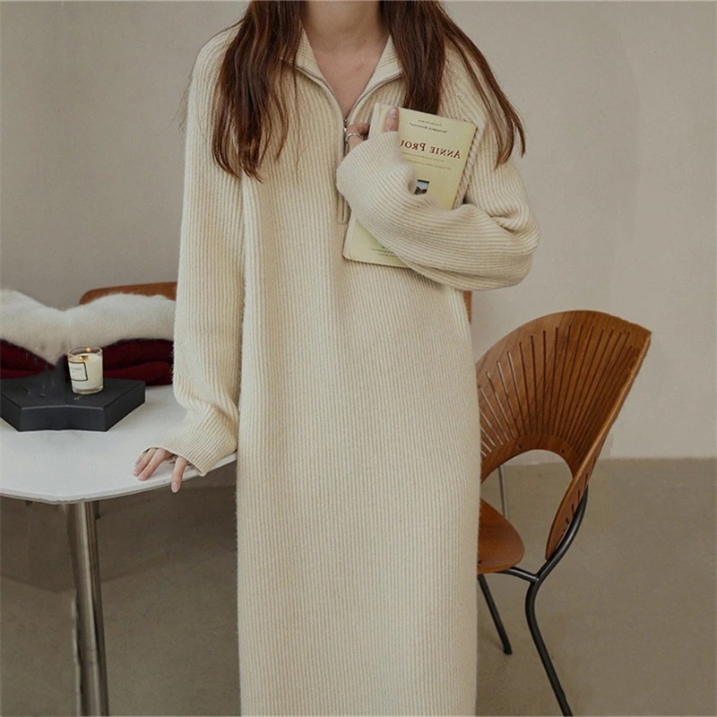 日系ラフなスタイルの膝丈ロング丈ラペル付きゆったりニットワンピース女性用秋冬インナーとして着られるニットワンピース
