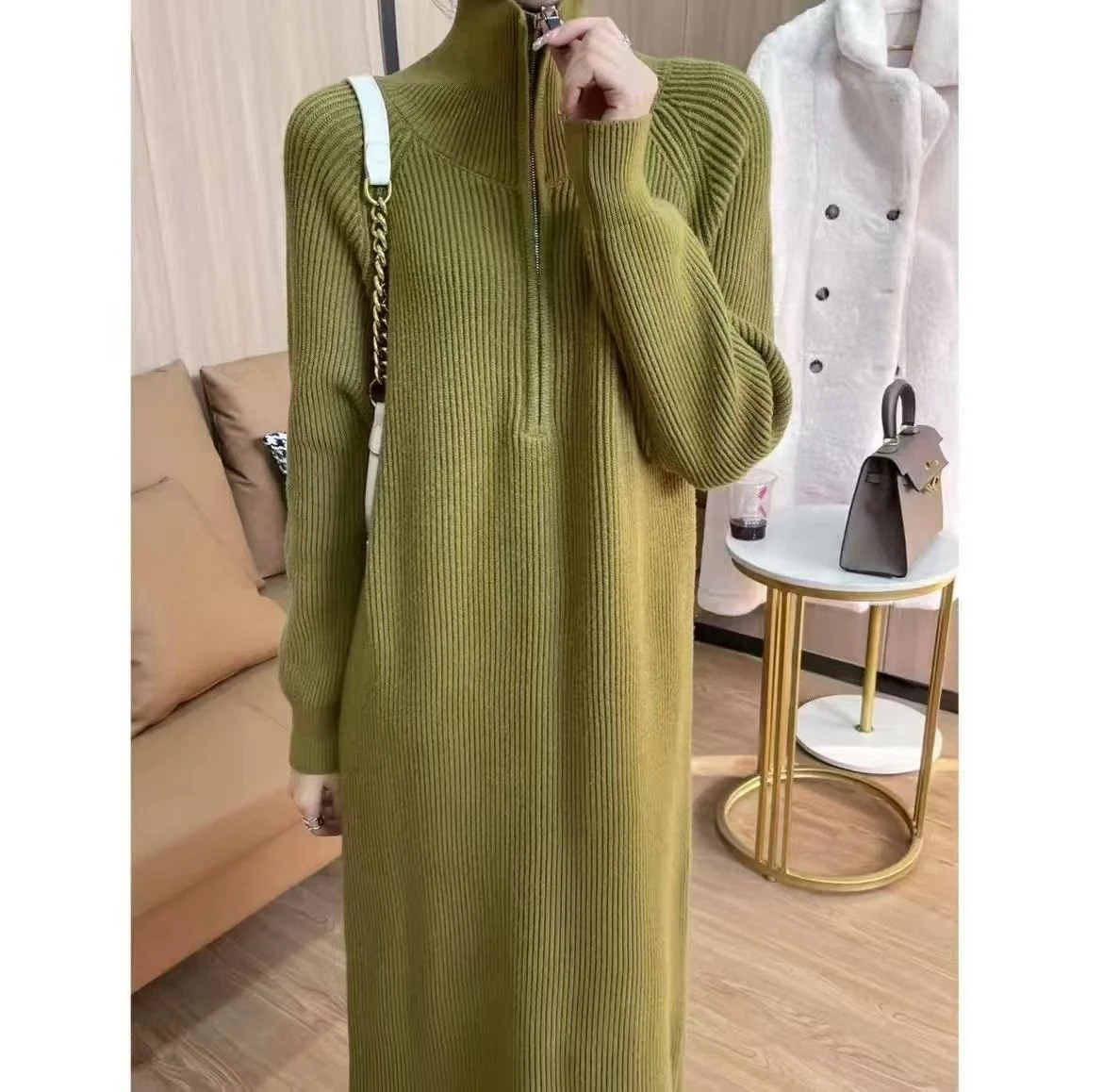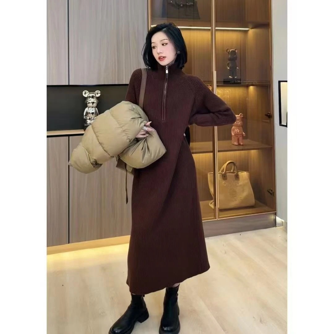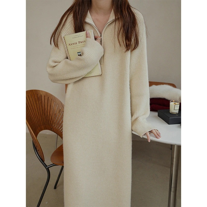 襟をめくってゆったりとしたけだるい風の毛のスカートの秋冬 新型韓国版ファッションニーミディアムニットボトムワンピースロング・長袖