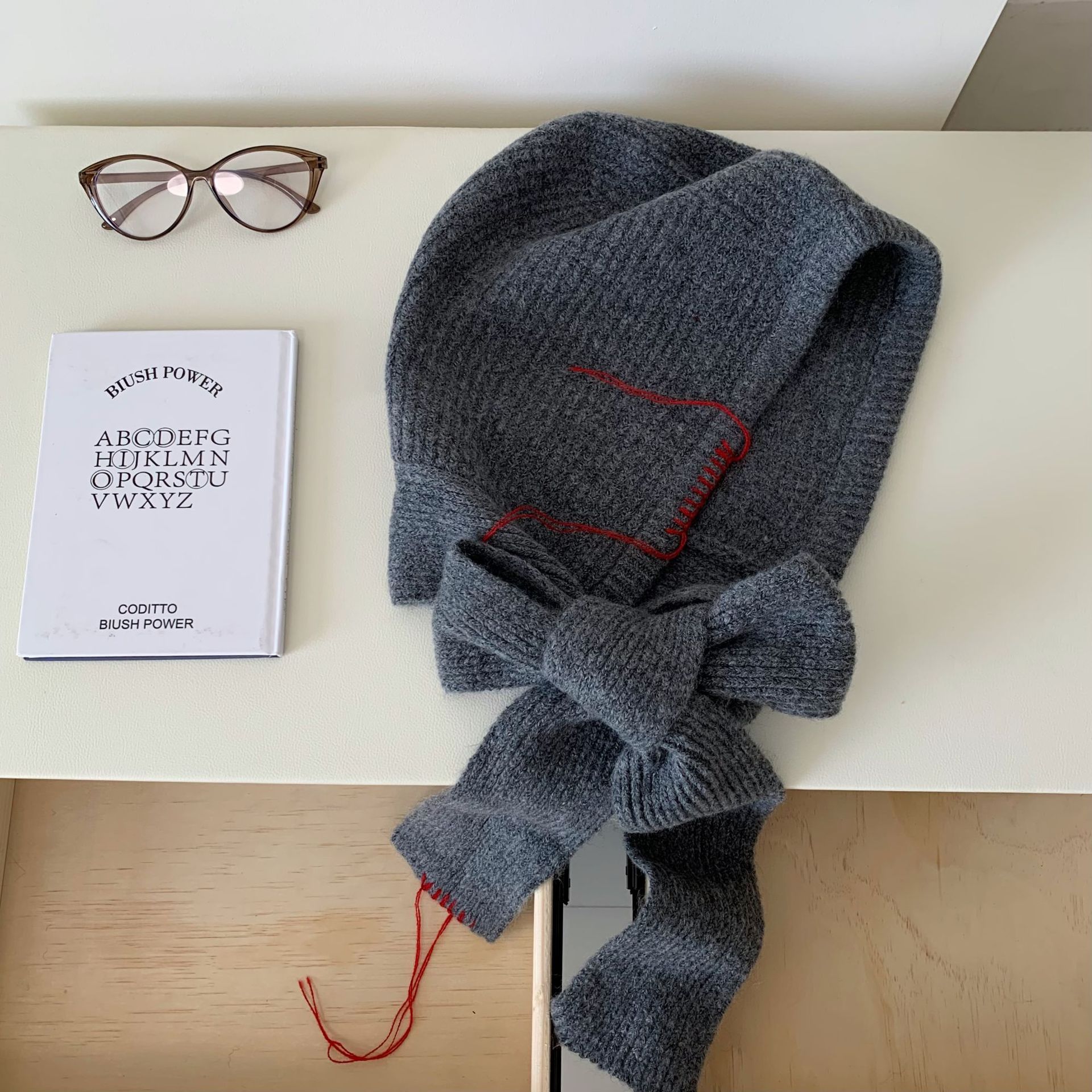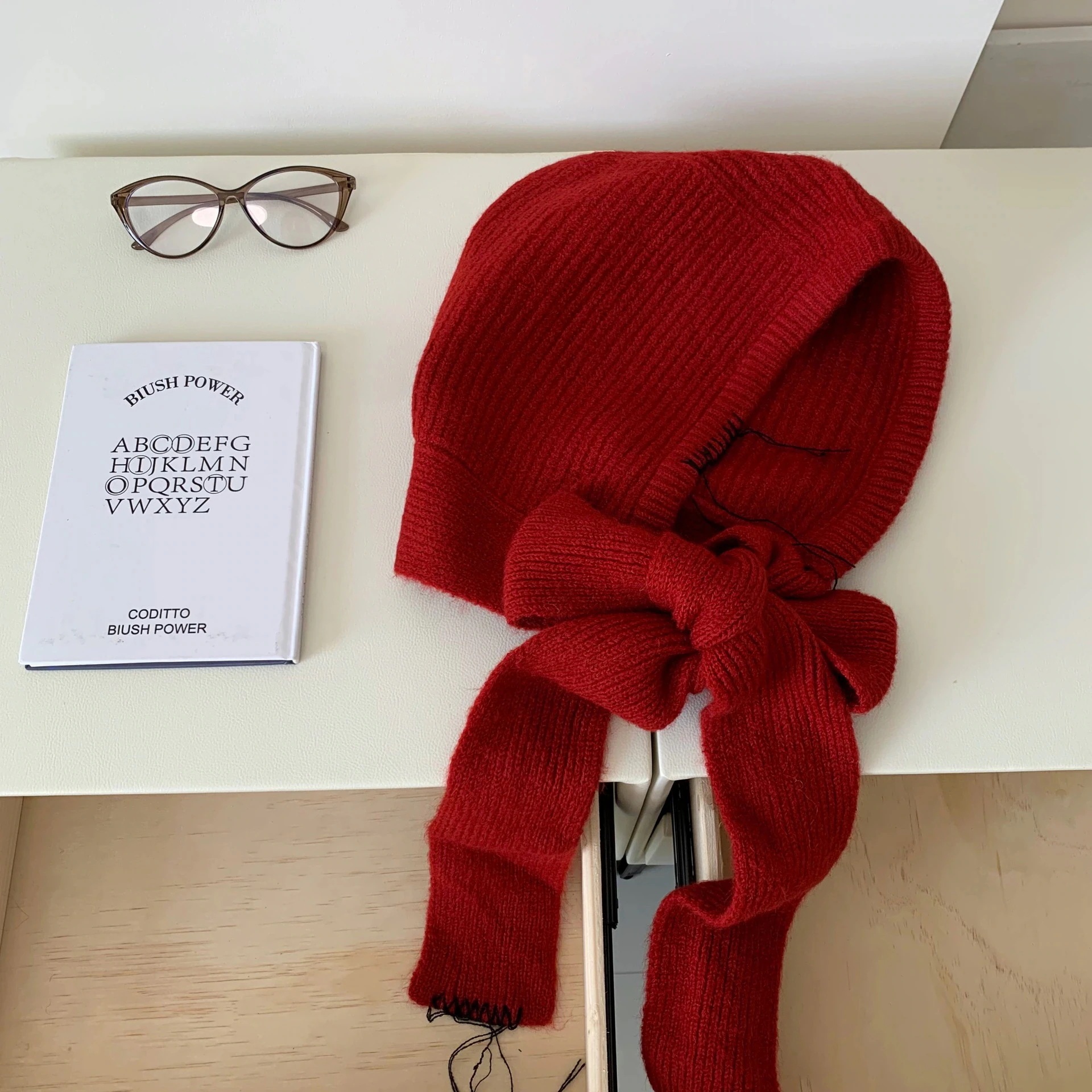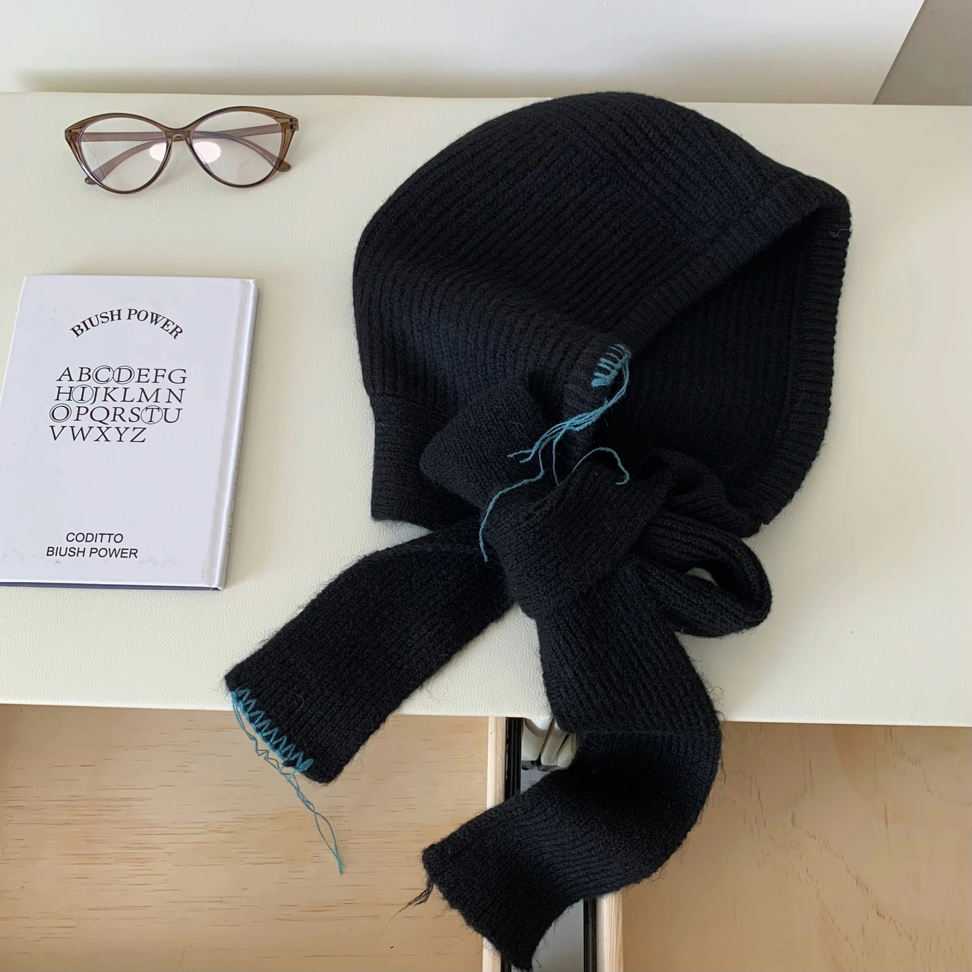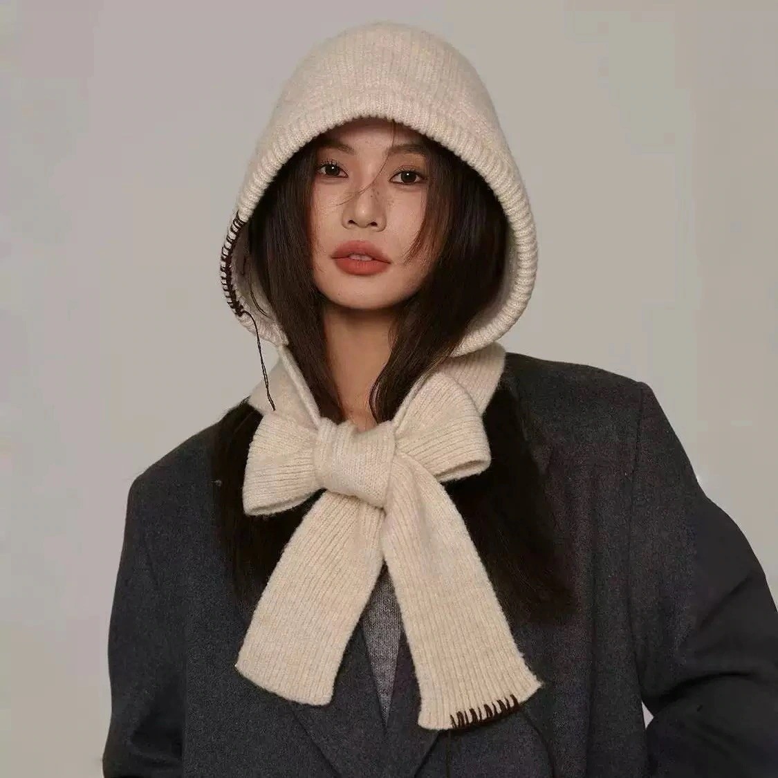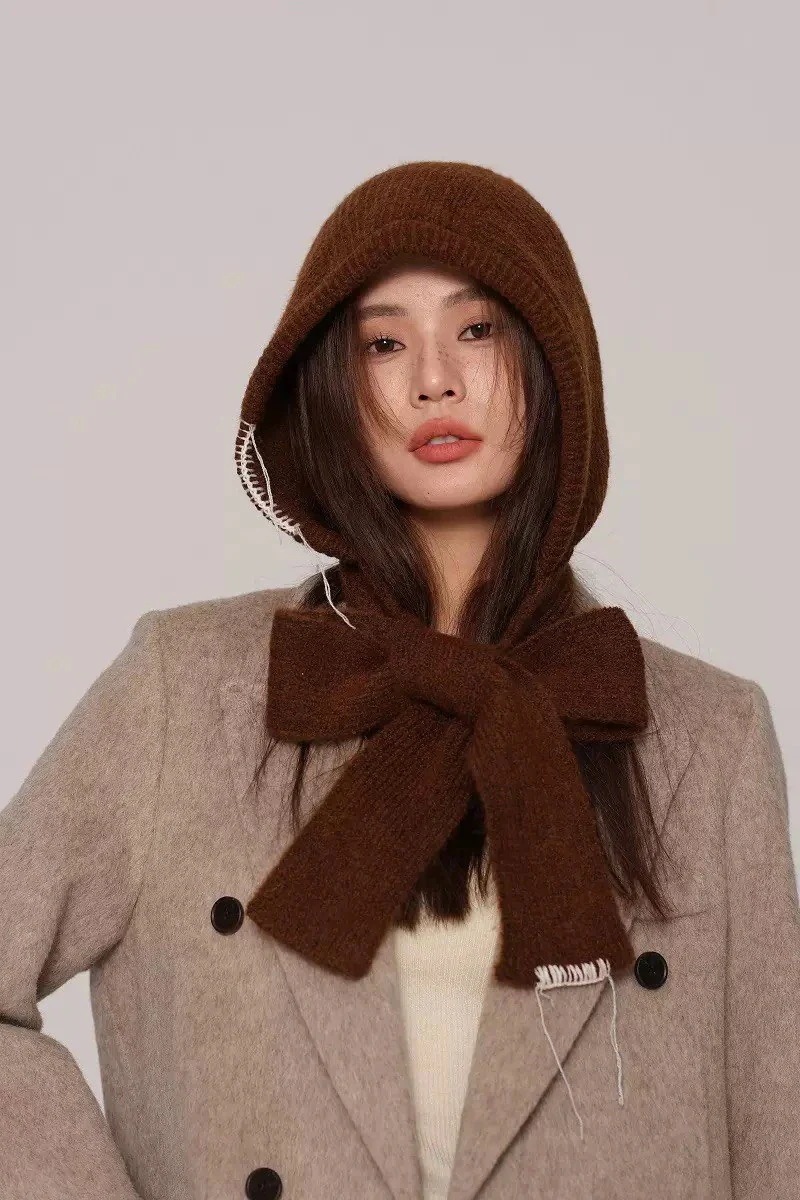 バラクラバ風ニット帽 韓国製帽子スカーフ一体バラクラバ女性冬新作防寒ニット帽スカーフ