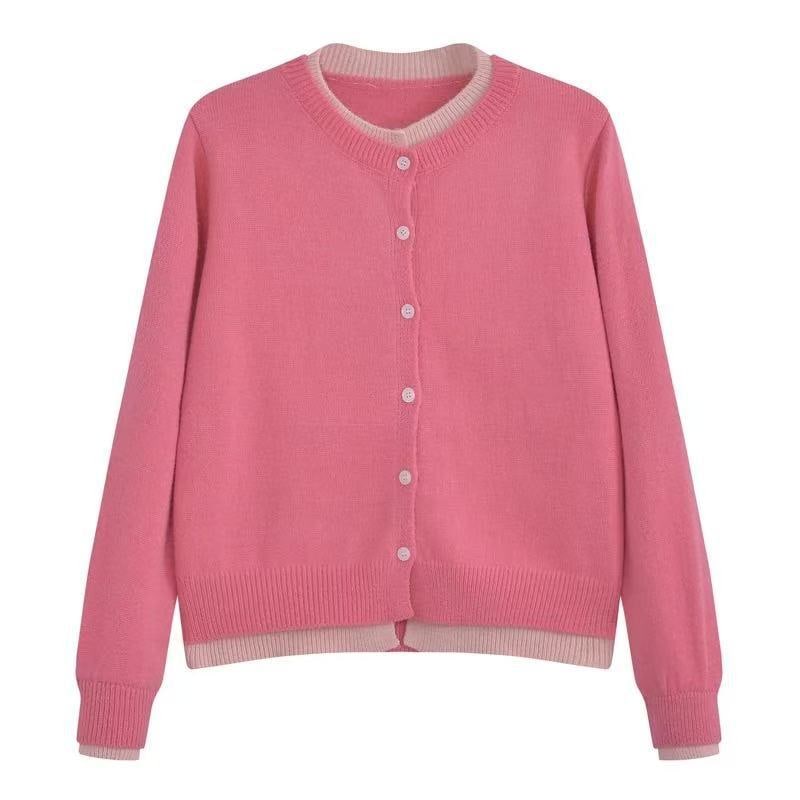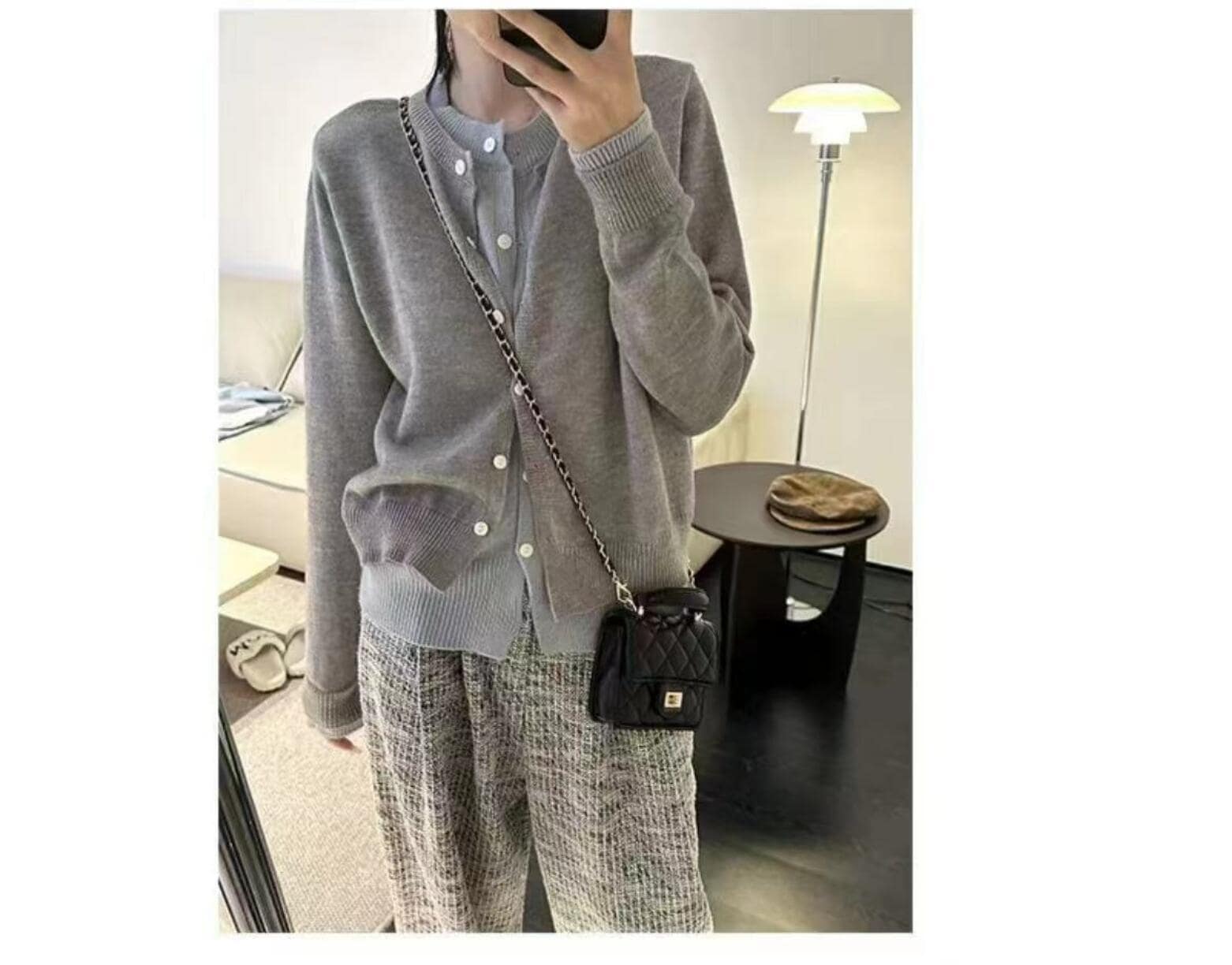 グレーのフェイク2枚丸首ボタンニットカーディガン女 2025秋新作婦人服韓国版セーター潮流ニットカーディガン