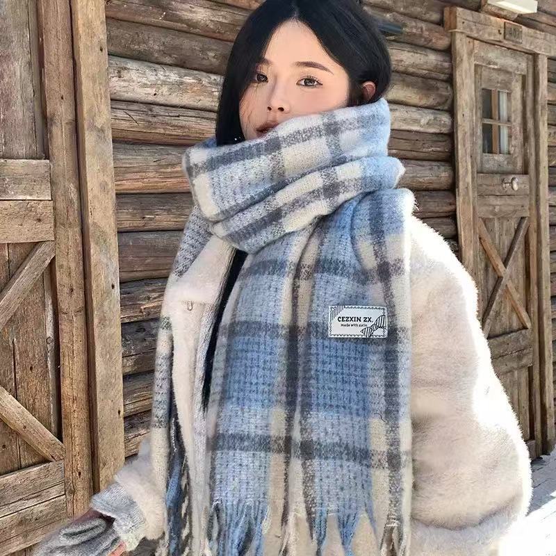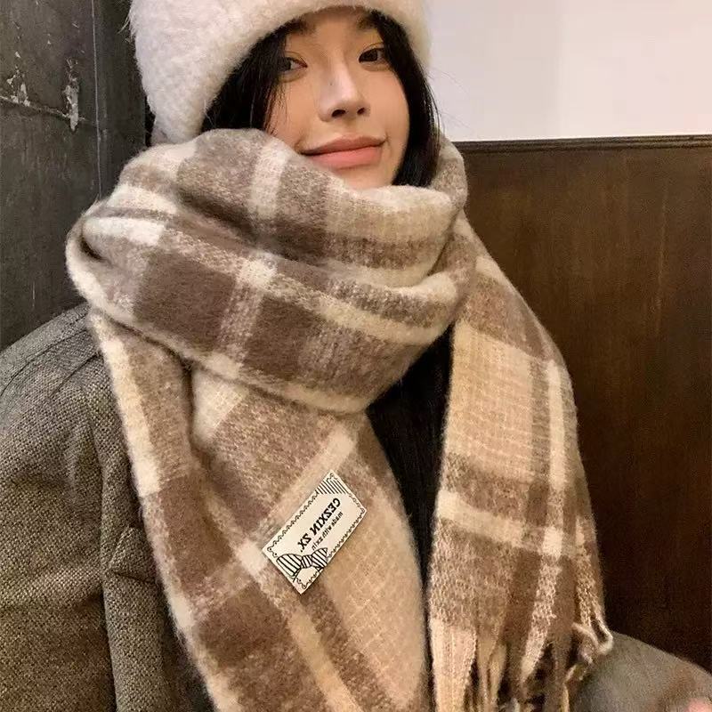 女性用ピンクのチェック柄モヘア スカーフ2025 年冬韓国スタイル暖かいショール / ネックウォーマー