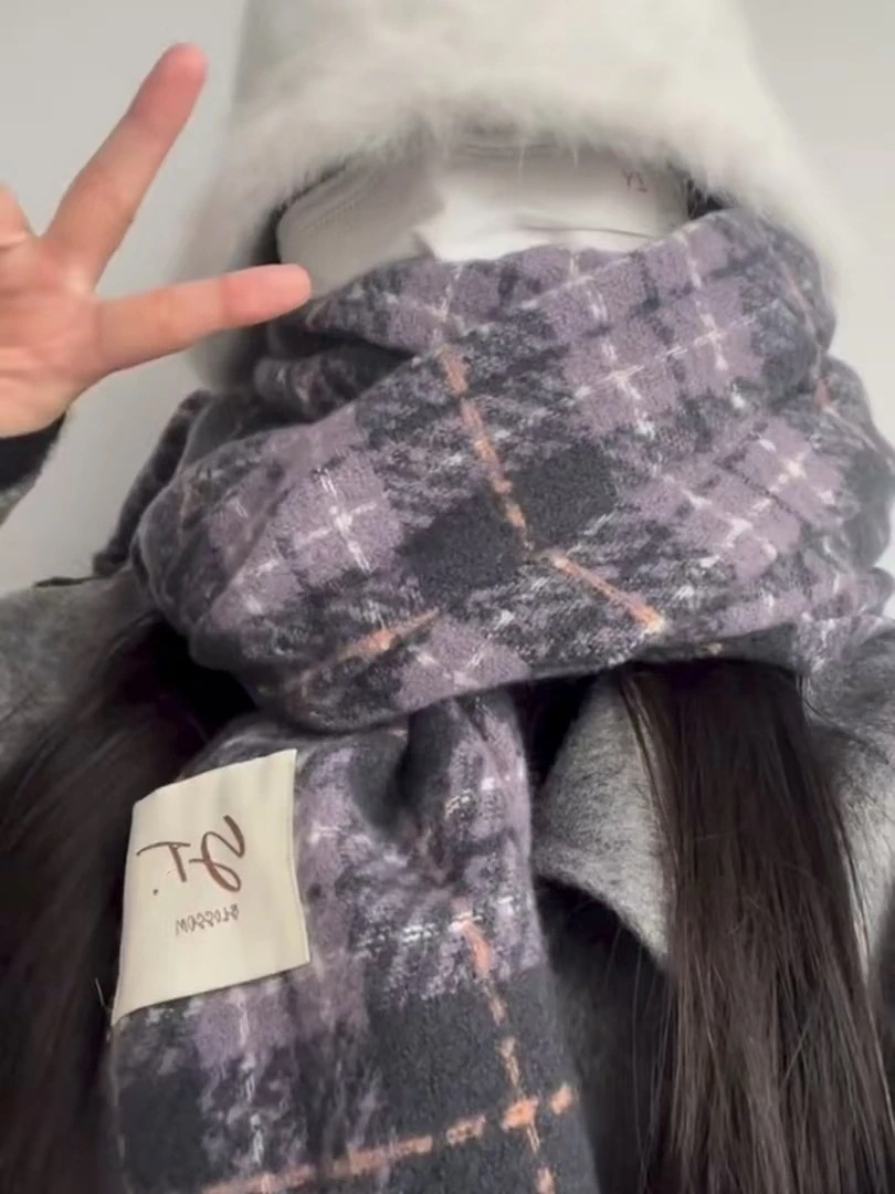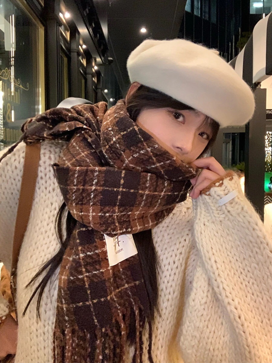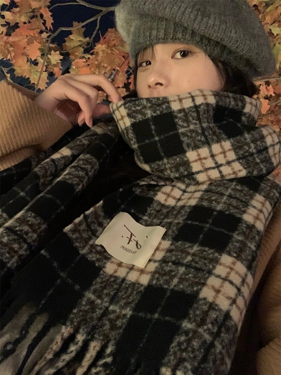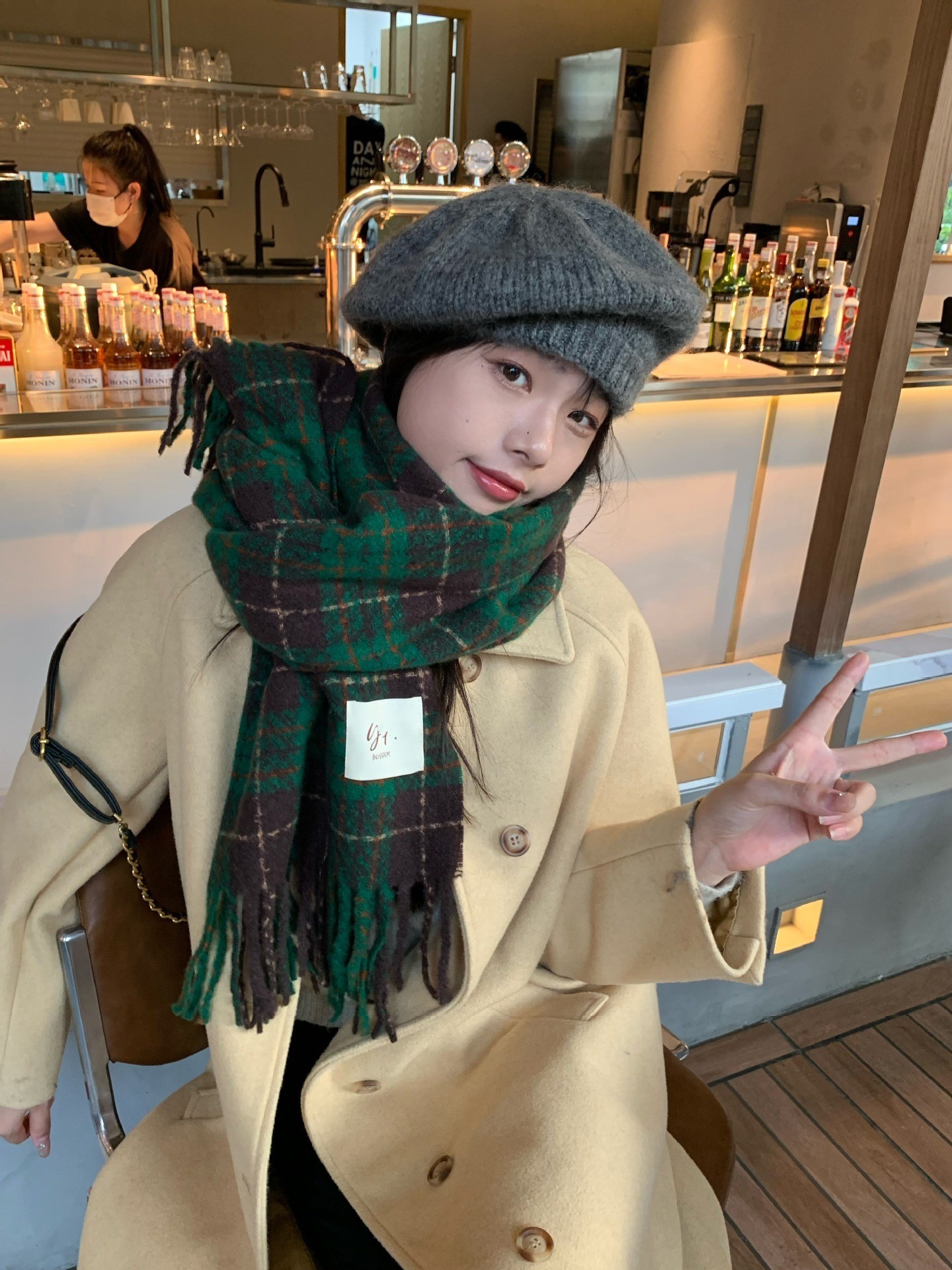 女性用のグリーンのチェック柄スカーフ韓国風魅力的多用途タッセル付きネックウォーマー極厚で長い暖かいショール