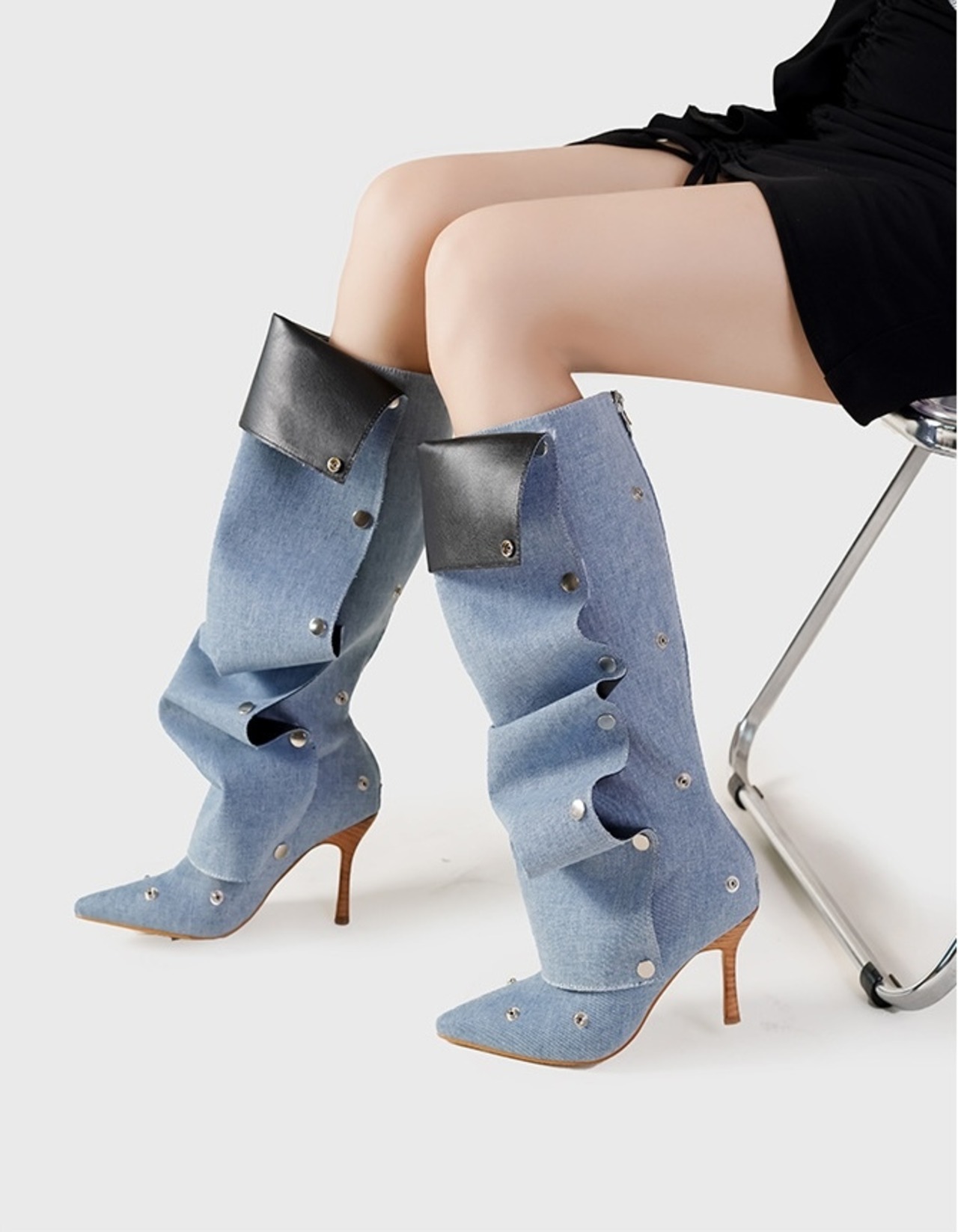 ルーズブーツ レディース デニム スエード風 ロングブーツ 秋冬 美脚 ポインテッドトゥ 変形デザイン ハイヒール 個性派 おしゃれ 靴 C548