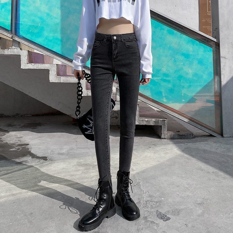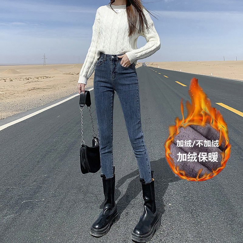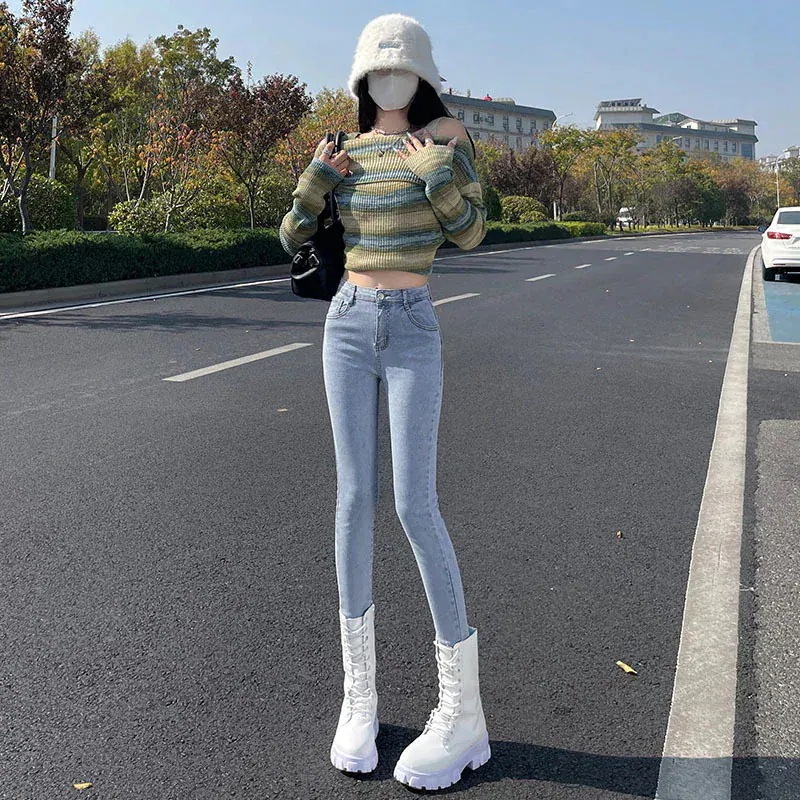 人気新作 秋冬 防寒 ロングパンツ 新作 韓国風 ハイウエスト ストレッチ スキニージーンズ 女性 ブルーグレー フィット感 痩せて見える 9分丈 タイト ペンシルパンツ