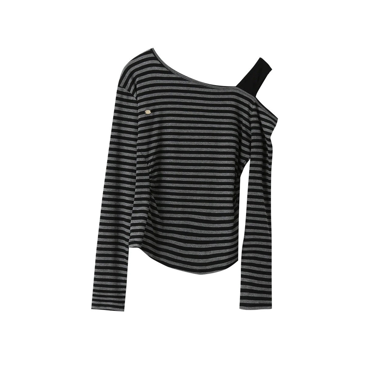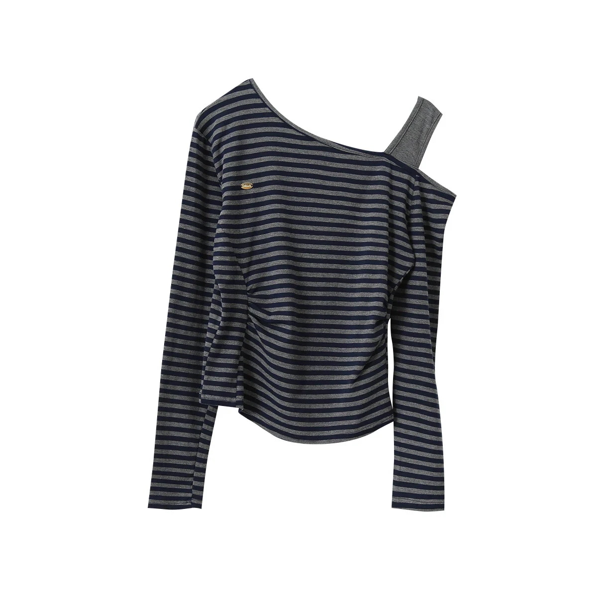 【人気商品】ロンT デザイン性 オフショルダー Vネック ストライプ 長袖 Tシャツ レディース スリムフィット ニッチ トップス レディースTシャツ 韓国ファッション