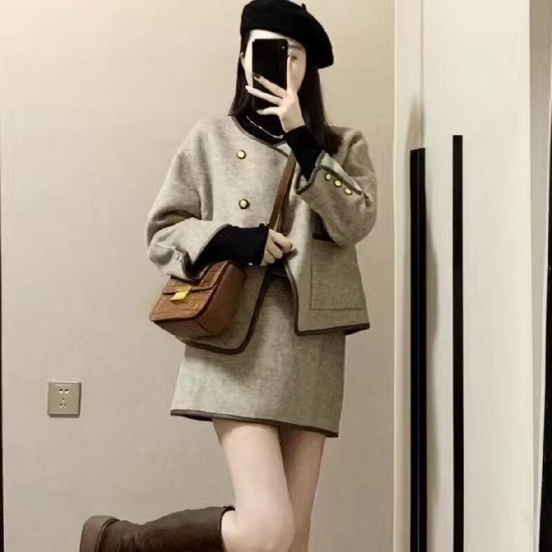 レディースファッション レディース秋冬オーラルージュエレガント シャネル風ニットコート + ハーフスカート 2 点セット