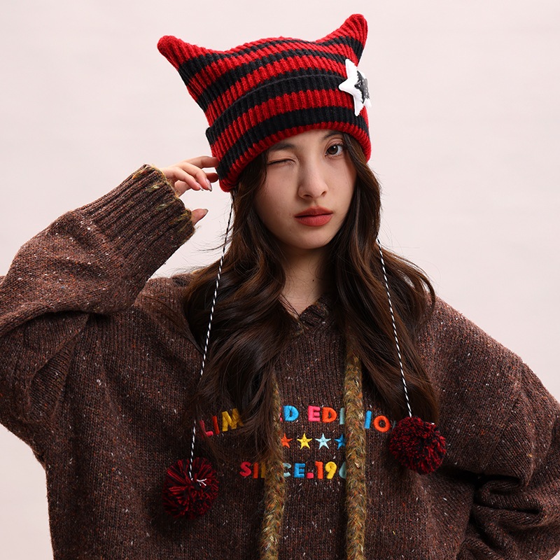比風手作りかわいい五星猫耳縞悪魔保温フードニットボール毛糸帽子女