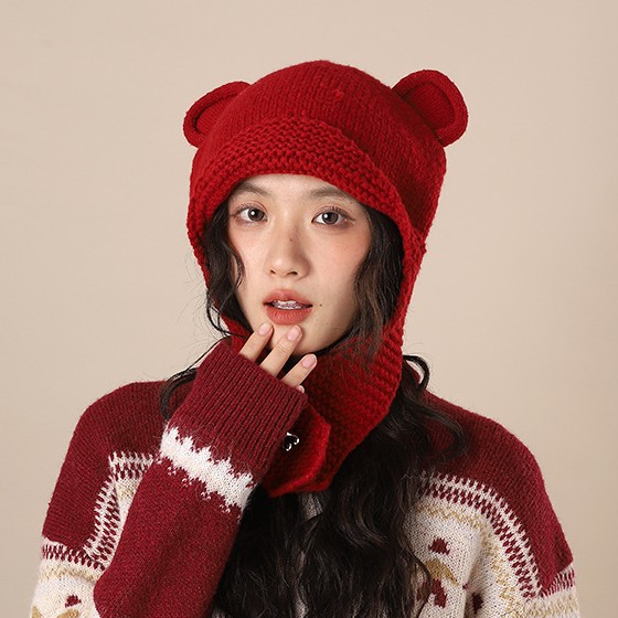 アンゴラの赤いかわいい熊の帽子の子供i保温耳の帽子のニットの大きい頭の周りの頭の帽子