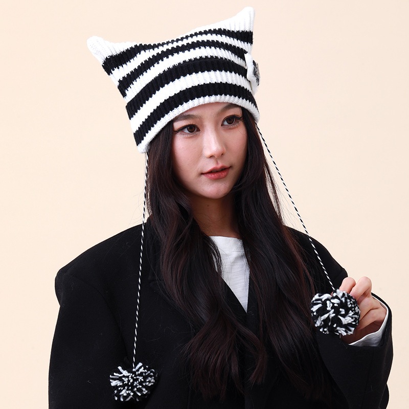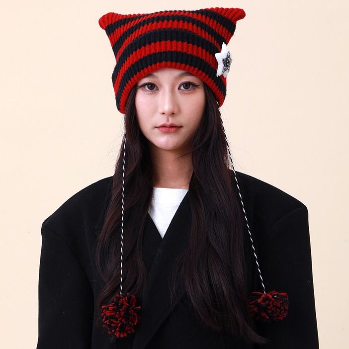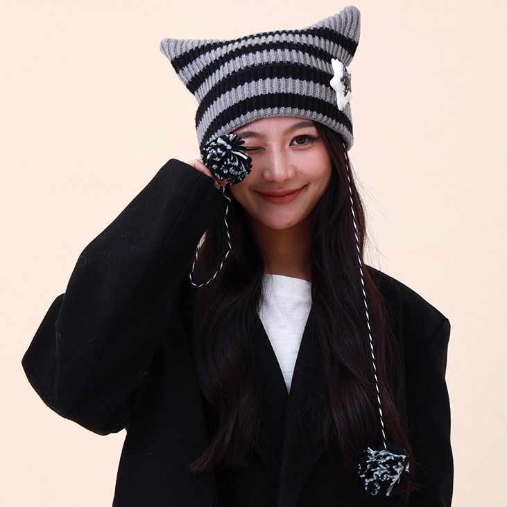 比風かわいい縞猫耳ニット毛糸帽子供天自転車保温耳保護カバー