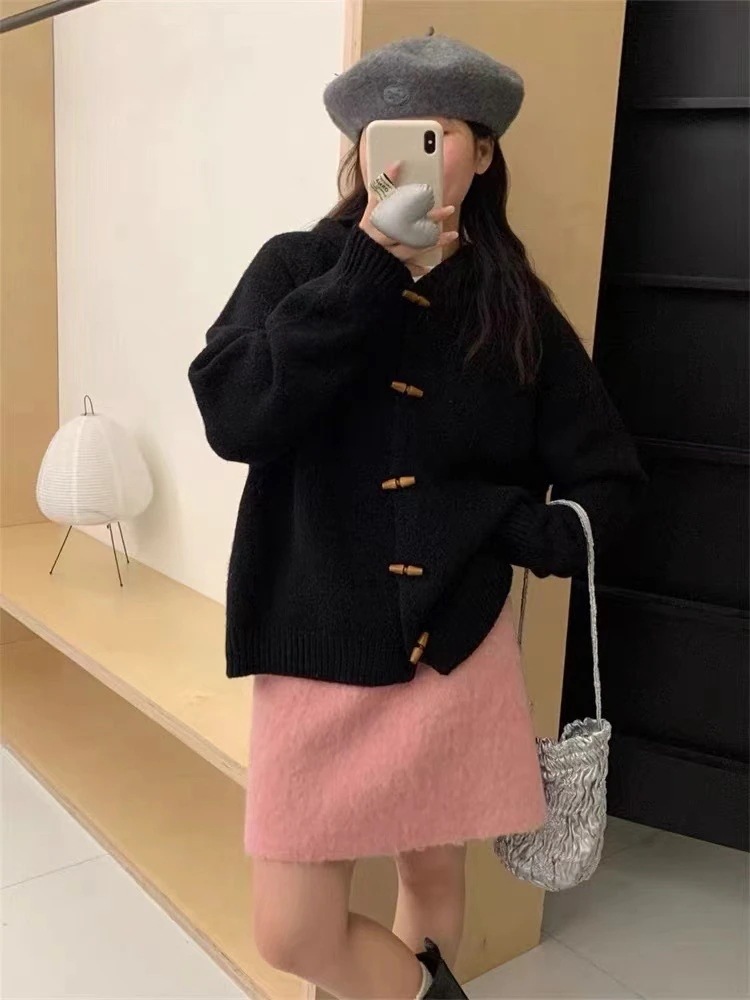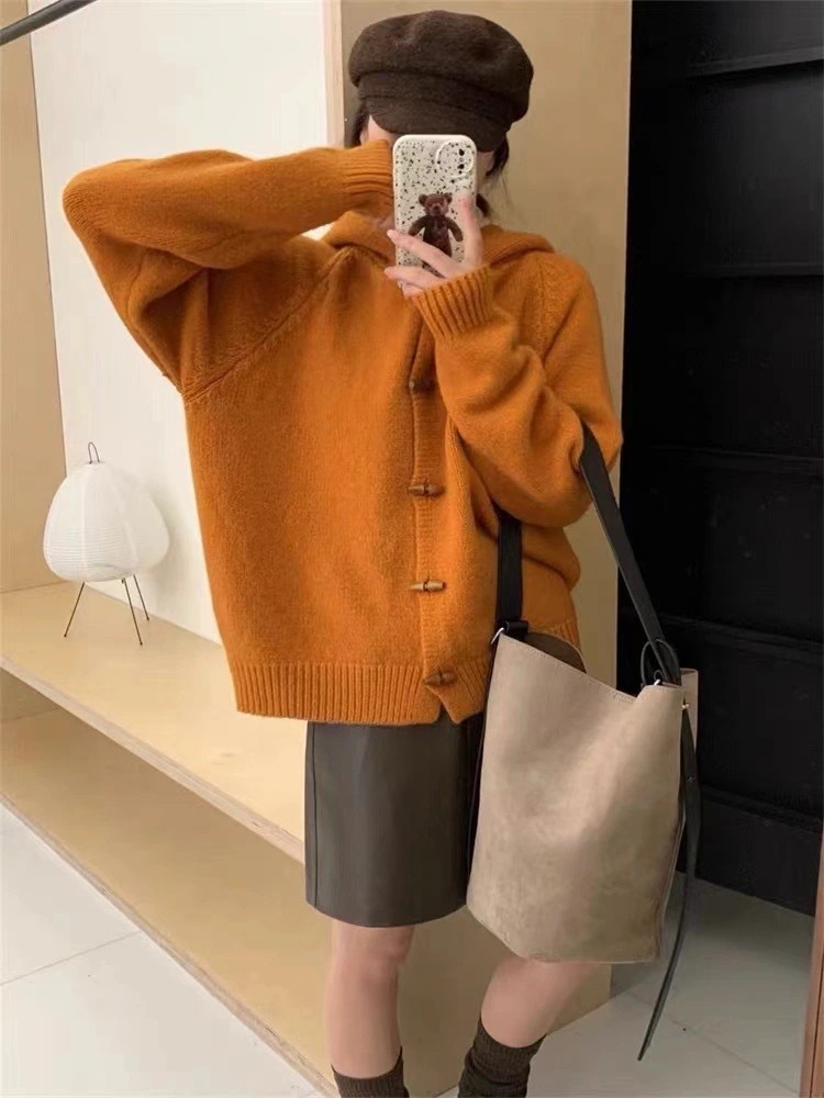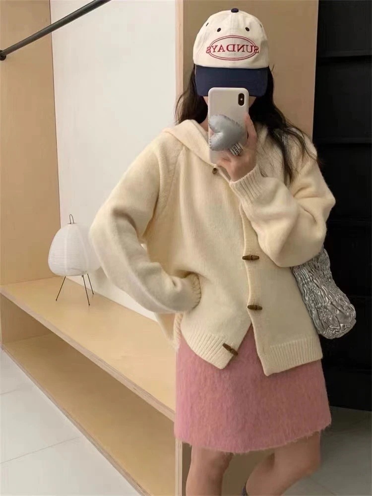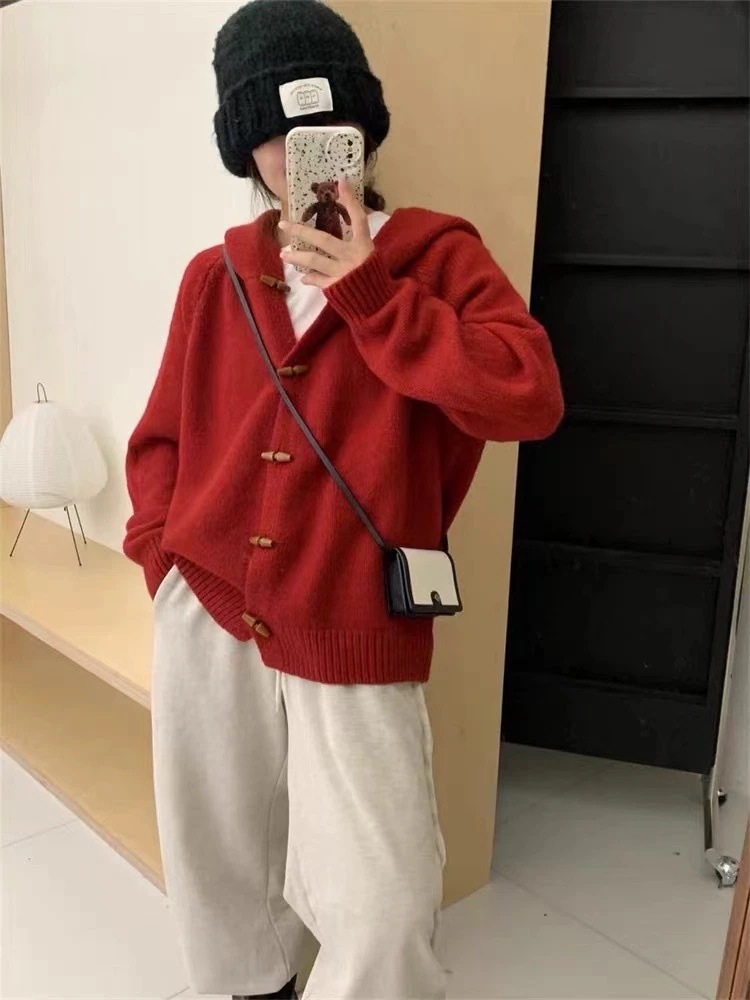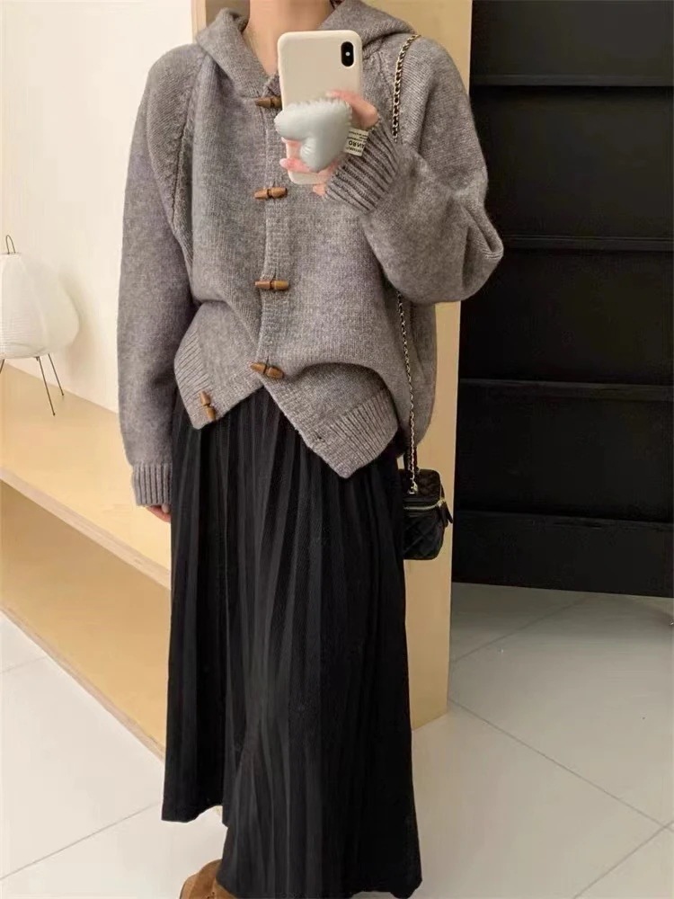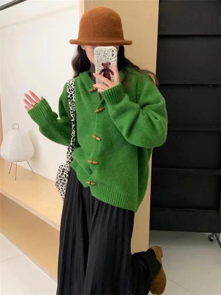 ヴィンテージオリーブ ウッドボタングリーン フード付きセーターコート レディース 2025 秋冬季 ルーズくつろぎデザイン ニットカーディガン