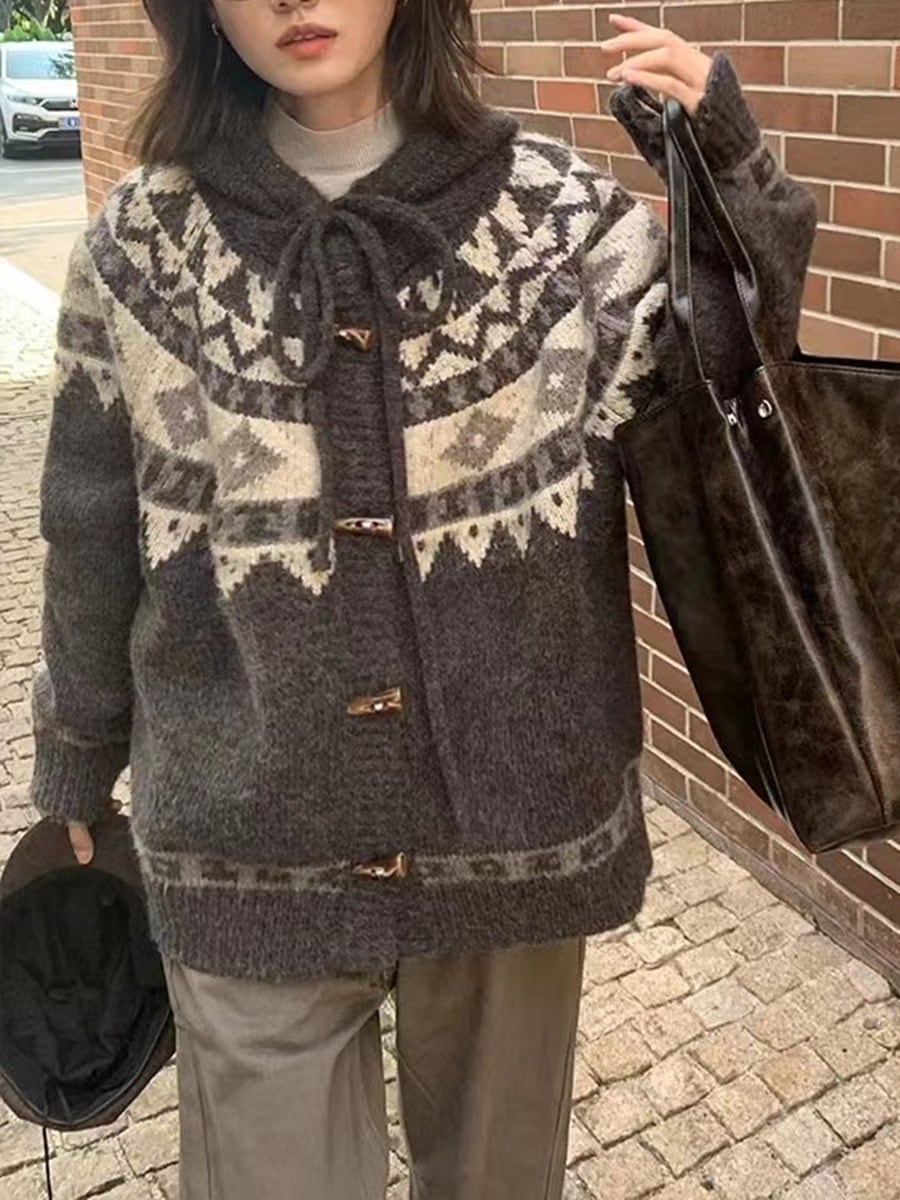 韓系ヴィンテージ風 フェアアイルジャカードセーターコート レディース 秋冬新モデル フード付きホーンボタン ルーズニットカーディガン