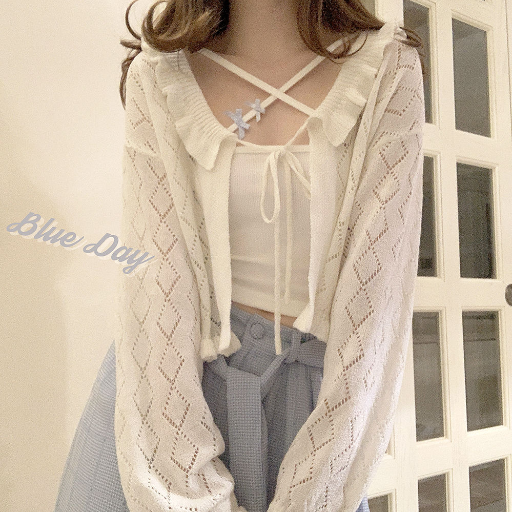 【大人気】 カーディガン レトロな透かし編みバインドニットカーディガントップス韓国ファッション 夏 日焼け止め 紫外線対策 長袖ブラウス薄手 アウター